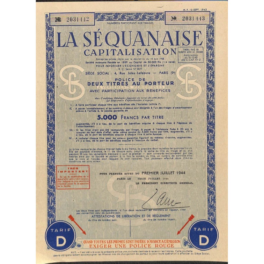 Polizza di due titoli al portatore a versamenti periodici del valore di 5000 Franchi per titolo.
