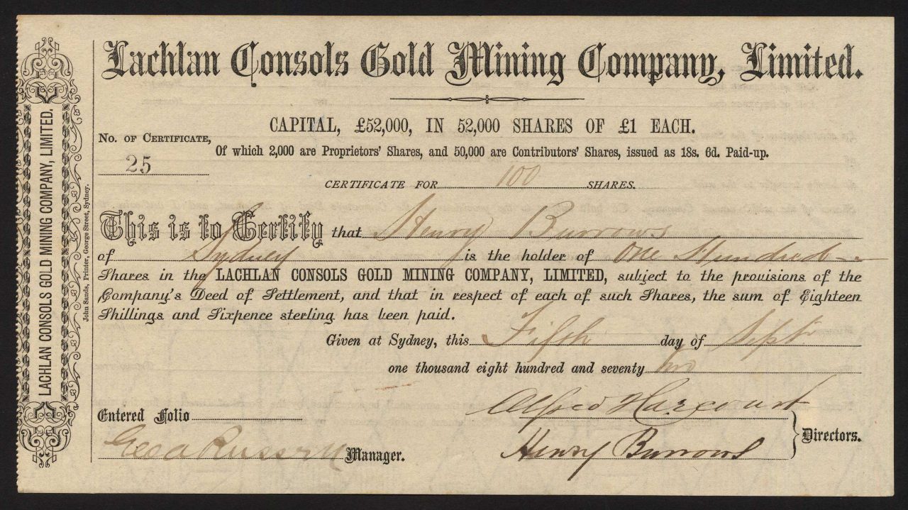 A-32385Lachlan Consols Gold Mining Company Limited-1Nuovo Galles del Sud1872£1 SharesR2 (1001-5000 pezzi)S2 (da 26 a 50 €)