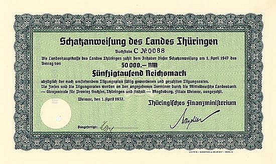 A-67420Land Thüringen-1Weimar19371 obbligazione 4,5% da 50.000 Marchi--
