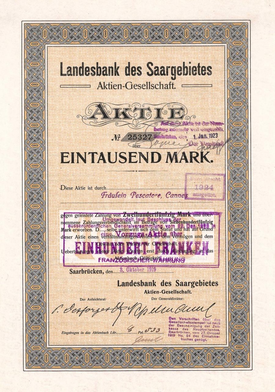 Fondata nel 1919 in risposta al cambiamento di potere nella Saarland dopo la fine della prima guerra mondiale da parte di banchieri e industriali tedeschi e francesi guidati dalla Société Nancéienne de Crédit Industriel et de Depots, Nancy, che era anche azionista di maggioranza. Oltre alla sede di Saarbrücken, vi erano 44 filiali a Saarlouis, St. Ingbert, Dillingen, Merzig, Völklingen, Ottweiler e Neunkirchen. Dopo che la Saarland fu portata “a casa del Reich”, la Landesbank andò in liquidazione nel 1935 “a seguito del mutato contesto politico”. I depositi e le altre voci di bilancio sono stati rilevati da DRESDNER BANK.