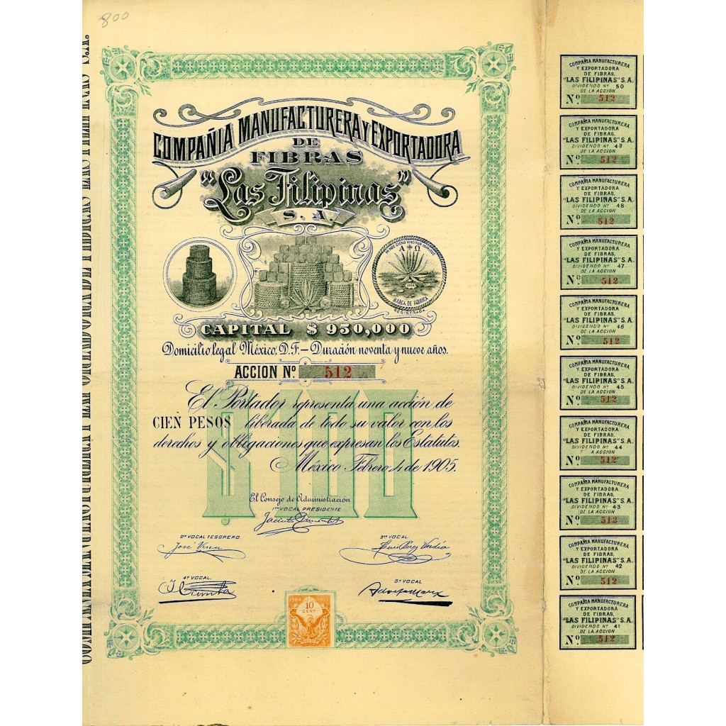 A-58310Las filipinas – comp. Manufacturera y exportadora de fibras-1 Città del Messico1905$100R2 (1001-5000 pezzi)S2 (da 26 a 50 €)