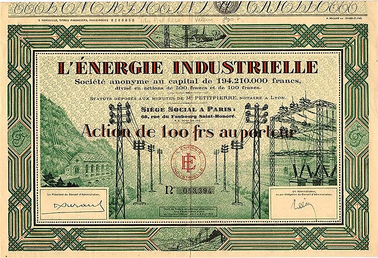 A-55555L’Energie Industrielle-1Parigi19321 azione al portatore da 100 FF--