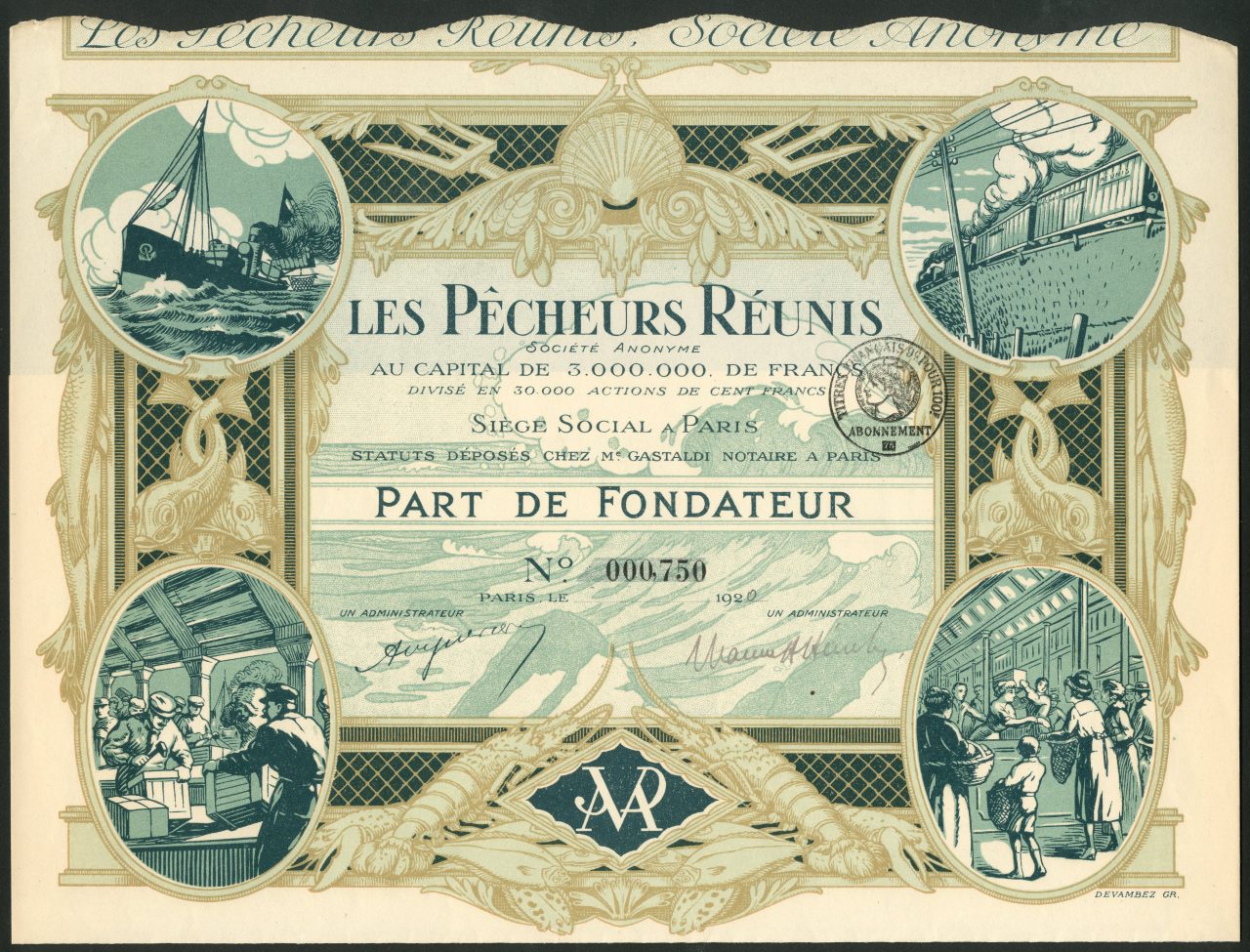 Elegante grafica a firma del celebre incisore parigino André Devambez (1867-1944): ornato in stile Liberty con pesci, crostacei, tridenti e conchiglie stilizzate. Agli angoli scorci di una nave in balìa dei flutti, treno a vapore in corsa, magazzini per la lavorazione e la spedizione dei prodotti ittici e mercato del pesce.