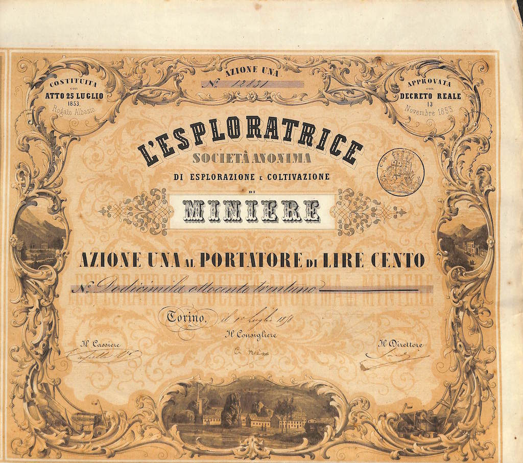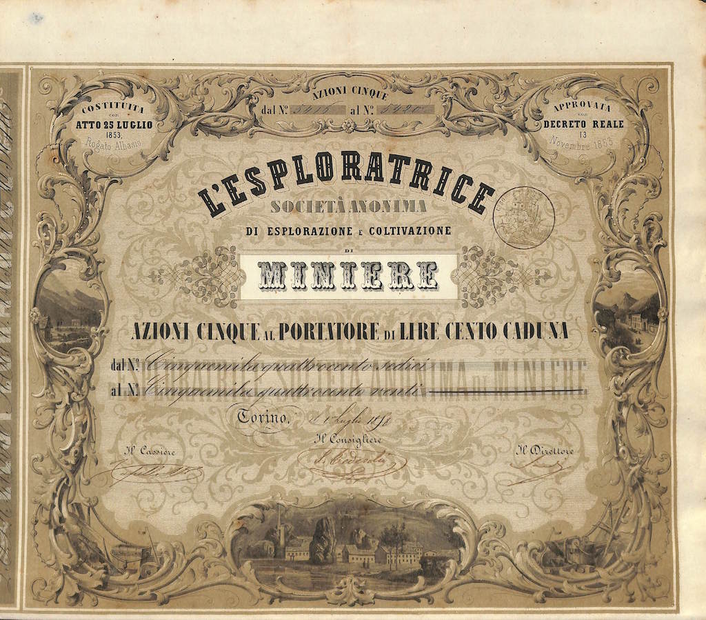La società ha vita breve: sette anni, dal 1853 alla fine del 1860 quando viene liquidata dopo la revoca delle concessioni. Ma rivediamone brevemente le vicissitudini. L’artefice della nascita dell’Esploratrice è il conte Camillo Benso di Cavour. Il 25 luglio del 1853 la società vede la luce con lo scopo di ricercare e sfruttare le miniere nel Regno Sardo.