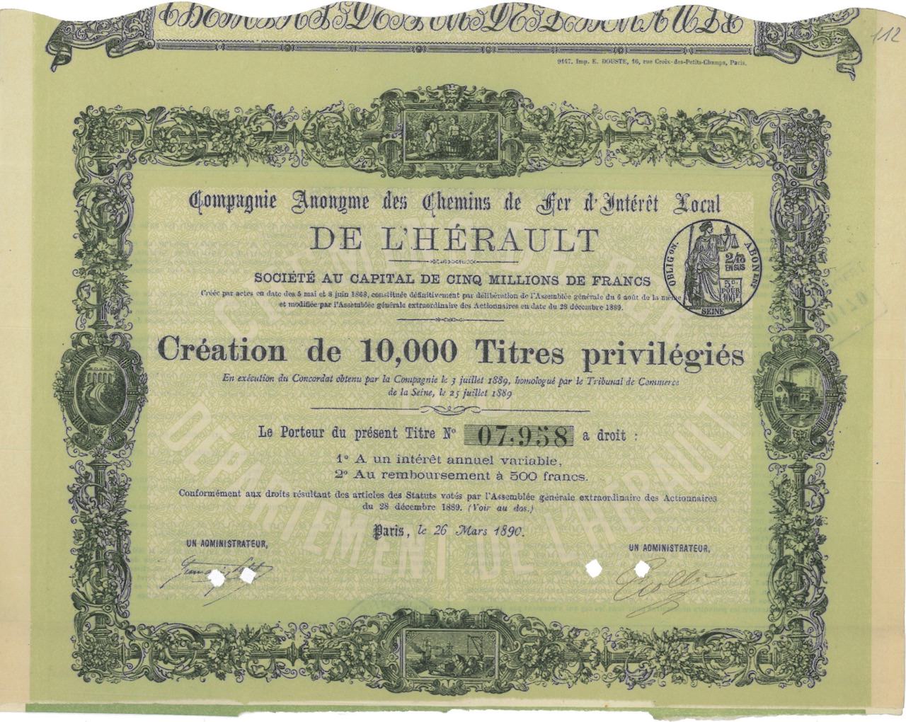 A-28775L’Herault – Comp. An. des Chemins de Fer d’Interet Local de-1N.D.Parigi18901 azioneR2 (1001-5000 pezzi)S1 (da 0 a 25 €)