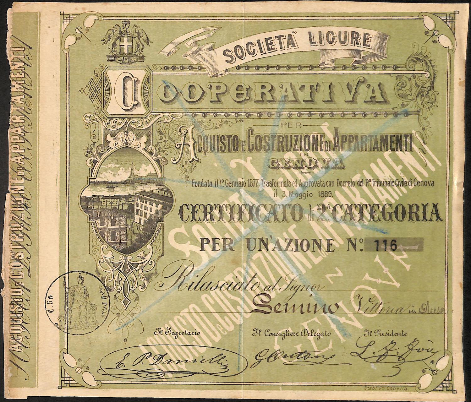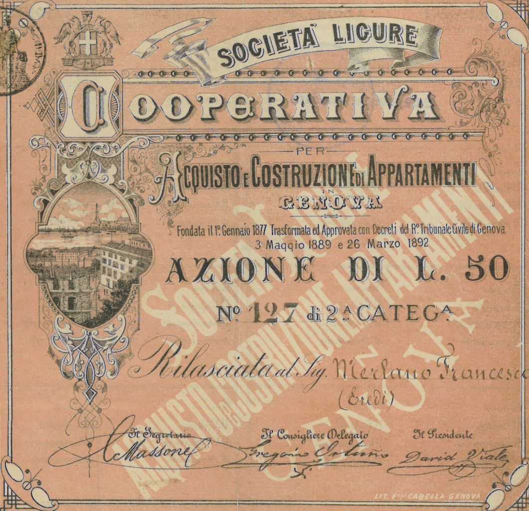 Scorcio di edifici e del porto di Genova con la celebre “Lanterna”. Dallo statuto si evince che “La società ha per scopo l’acquisto o la costruzione di case civili per assegnare ad ogni azione un appartamento od altro locale. …Il capitale è composto di 886 azioni di Lire 50 ognuna: per ogni azione inoltre è rilasciato ad ogni azionista un libretto per i versamenti a conto del prezzo degli appartamenti o di altri locali dei quali risultasse assegnatario. I libretti sono di due categorie: quelli di prima categoria nel numero di 386 corrispondente a quello delle azioni relative….e quelli di seconda categoria in numero di 500, che corrispondono alle azioni di tale categoria…”. La società era ancora attiva nel 1927.