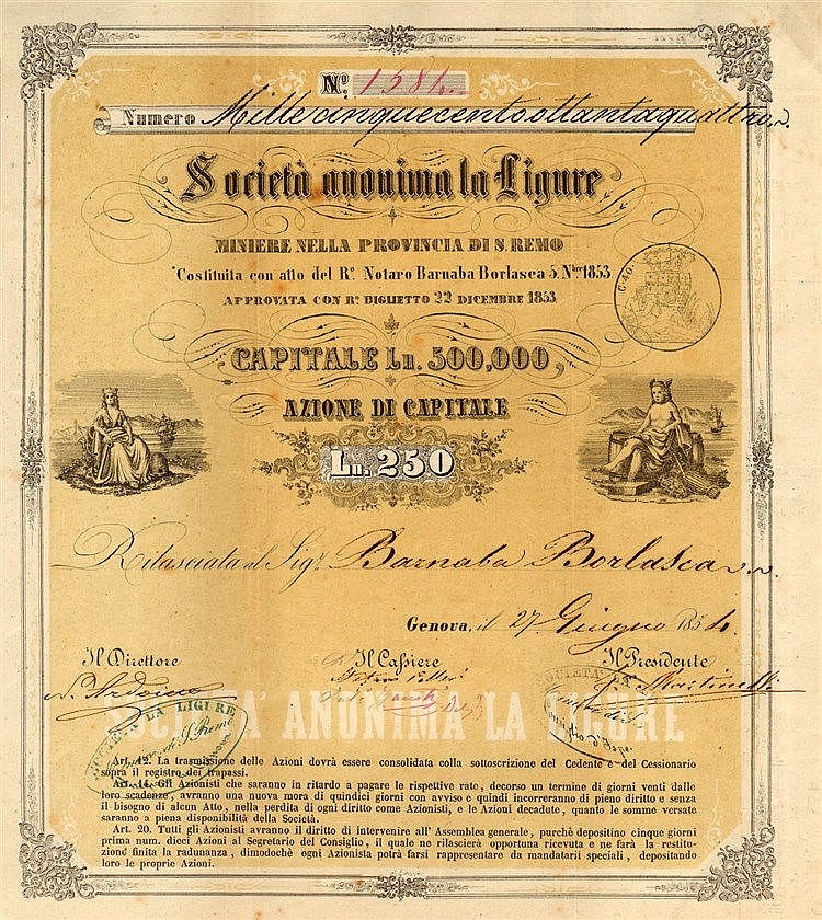 Ai lati personificazioni dell’Italia con corona turrita e del dio del Commercio con berretto alato e caduceo. Il titolo, assai raro, è intestato al notaio che ne stilò l’atto di costituzione. La compagnia operava nella zona di Monte Ceppo, nell’immediato entroterra sanremese in provincia di Imperia, uno sperone delle Alpi Marittime a 1627 metri di altezza.