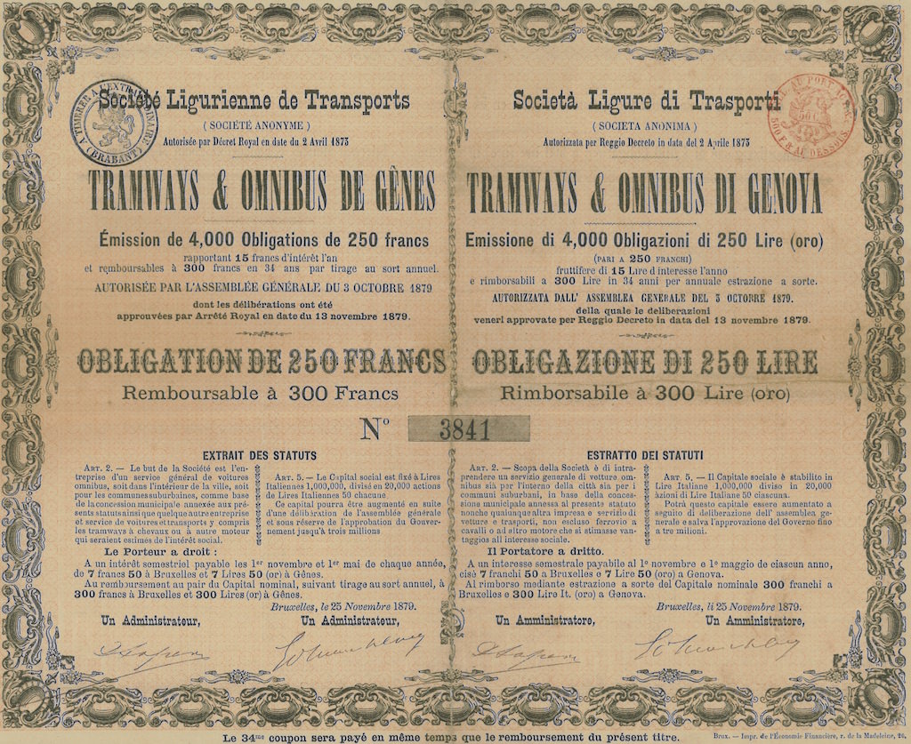 B-2718Ligure di Trasporti Tramways & Omnibus di Genova Soc.-2Impr. de l’Économie Financière - BruxellesBruxelles18791 obbligazioneR4 (251-500 pezzi)S4 (da 101 a 250 €)