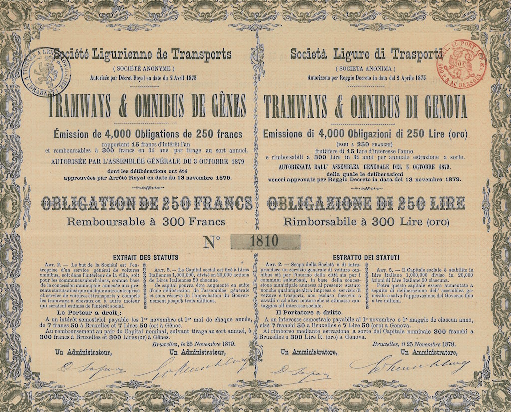 B-2718Ligure di Trasporti Tramways & Omnibus di Genova Soc.-2Impr. de l’Économie Financière - BruxellesBruxelles18791 obbligazioneR4 (251-500 pezzi)S4 (da 101 a 250 €)