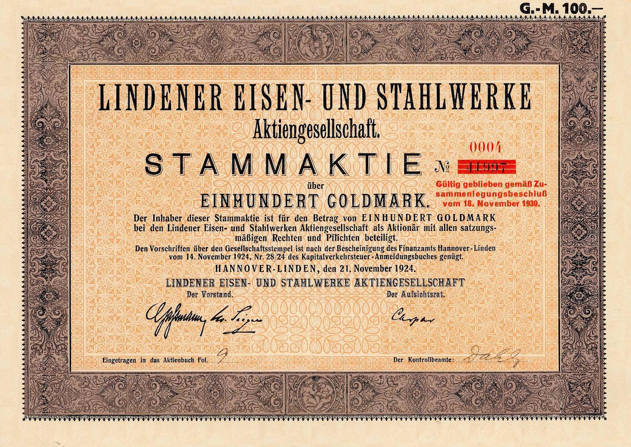 La fonderia di ferro e acciaio Linden fu fondata da Andreas Dickert nel 1866. Trasformata in Commandit-Ges nel 1878, nel 1895 in una AG. La specialità era la ghisa grigia e la produzione di colonne in ghisa. Dal 1881 furono prodotti anche gli ingranaggi (una tradizione che continua nell’odierna filiale di Hannover della Augsburger Renk AG). I contratti di armamento assicurarono un buon impiego durante la prima guerra mondiale, che fu accompagnata dall’espansione costruttiva della fabbrica tra Badenstedter e Davenstedter Strasse (ancora uno dei più bei fabbricati di fabbrica di Hannover, nelle immediate vicinanze di Körting) e la costruzione della (conservata fino ad oggi) Villa del regista a Niemeyerstr. 16/17. Dopo la guerra furono fabbricati anche ingranaggi e accessori, e come specialità, sistemi di smerigliatura, frantoi rotanti e frantoi a mascelle, specialmente per l’industria del cemento, che è ampiamente rappresentata nell’area di Hannover. Nel 1924 Bergbau-AG Lorraine subentra alla L.E.S. e anche la maggior parte delle azioni di Hanomag e allo stesso tempo, fuggendo dall’occupazione francese della regione della Ruhr, trasferì la propria sede centrale da Bochum ad Hannover. Al culmine della Grande Depressione nel 1932, fu fatto un confronto, parti dei locali dell’azienda furono poi vendute al produttore di sapone Orpil. Il L.E.S. finì nel 1947 nella lista di smantellamento degli Alleati, dopo che la produzione fu in gran parte distrutta da colpi di bomba nel 1943 e 1945 e si arrestò. Solo nel 1952, dopo l’acquisizione da parte della Phoenix-Rheinrohr AG Vereinigte Mütten- und Röhrenwerke, le operazioni furono riprese come “Lindener Eisen- und Stahlwerke GmbH”. Gli ingranaggi, conici e cilindrici, nonché i pezzi di ricambio per l’industria mineraria, del cemento e della calce, per le attività di laminazione e acciaio, nonché per le macchine, i veicoli e la costruzione navale ora hanno lasciato la fonderia di acciaio a Linden. Dopo l’acquisizione di Phoenix Rheinrohr da parte di Thyssen, la produzione fu interrotta ad Hannover nel 1967/68 nonostante una buona situazione di ordine e oltre 500 dipendenti persero il lavoro. L’area della fabbrica fu quindi utilizzata dal commerciante di acciaio Thyssen-Schulte.