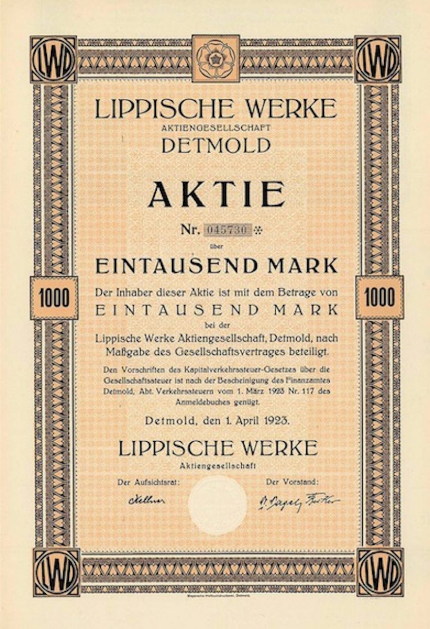 Quando fu fondata nel 1916 nel mezzo della prima guerra mondiale come “Fürstlich Lippische Staatswerkstätten AG”, diverse società di lavorazione del metallo erano raggruppate nel Principato di Schaumburg-Lippe a quel tempo (e fino all’integrazione in NRW dopo la seconda guerra mondiale) per razionalizzare la produzione bellica. La forza trainante fu l’industriale della macchina tessile Walter Kellner di (Wuppertal-) Barmen, che sedeva nell’AR accanto ad altri grandi personaggi locali come il Principe Bernhard Lippe, il Ministro di Stato Frhr. Biedenweg e il direttore della Landesbank Otto Thörner di Detmold. La società non era specializzata in qualcosa di speciale, ma aveva un grande magazzino per la produzione di macchine e articoli in metallo di ogni tipo con la fabbrica di macchinari, la fabbrica di mobili e la fabbrica di vagoni. A causa dei grandi ordini dell’esercito, i dividendi del 10% all’epoca erano ancora sufficienti. Rinominata nel 1920 come sopra e nel 1922 in Lippische Werke AG. Nel 1921 iniziò la produzione di camion, motocicli e macchine. La motocicletta L.W.D. prodotta nel 1923-24 con 2 motori HP a quattro tempi e una cilindrata di 69 cc è stata venduta attraverso la “Lippische Motorfahrzeuge Verkaufs-AG” di Berlino e si poteva (come precursore dei nostri ciclomotori) guidare senza patente. Fino al fallimento del 1926 (in cui la banca J. F. Schröder di Brema era il principale creditore insieme alle autorità finanziarie) era quotata ufficialmente alla borsa di Berlino.
