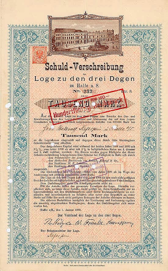 Per volere di Federico il Grande, poco dopo la sua ascesa al trono, fu fondata la Grande Loggia Madre Nazionale “Ai Tre Mondi”. La data di fondazione è il 13/9/1740. Secondo l’usanza del tempo, la madre stessa ha donato logge, ecc. ad Halle, Meiningen, Frankfurt an der Oder, Breslau, Dresda, Neuchatel. Nel 1744 prese quindi il nome di “Grande Loggia Madre Reale per i Tre Mondi” e infine nel 1772 lo cambiò in “Grande Loggia Madre Nazionale degli Stati Prussiani”. Dopo la fine della seconda guerra mondiale, la “Grande Loggia Madre Nazionale dei Tre Mondi” fu ripristinata a Berlino nel 1946, anche se limitata al settore americano. Dal 1963 è membro delle United Grand Logges of Germany. Con circa 800 fratelli, la “Great National Mother Lodge for the Three Worlds” è la terza più grande nella rete delle grandi logge unite. L’edificio tardo classico del “Loge zu den Drei Degen” a Moritzburgring 10, costruito nel 1867 e ristrutturato nel 1887, si trova ad Halle, secondo la tradizione della Scuola Schinkel di Berlino. Sotto la pressione del governo, la proprietà dovette essere trasferita alla città di Halle durante l’era nazista; dopo la guerra, l’esercito sovietico la utilizzò come sede per scopi culturali. Dal 1952 l’edificio dell’Università Martin Luther di Halle-Wittenberg fungeva da aula. Nel 1998 la “Grande Loggia Madre per i Tre Mondi”, il successore legale della Loggia per le Tre Spade, ha ricevuto indietro la proprietà. L’edificio è rimasto vuoto dal 2001 al 2009 e dal 2009 appartiene alla Leopoldina (Accademia Nazionale delle Scienze).