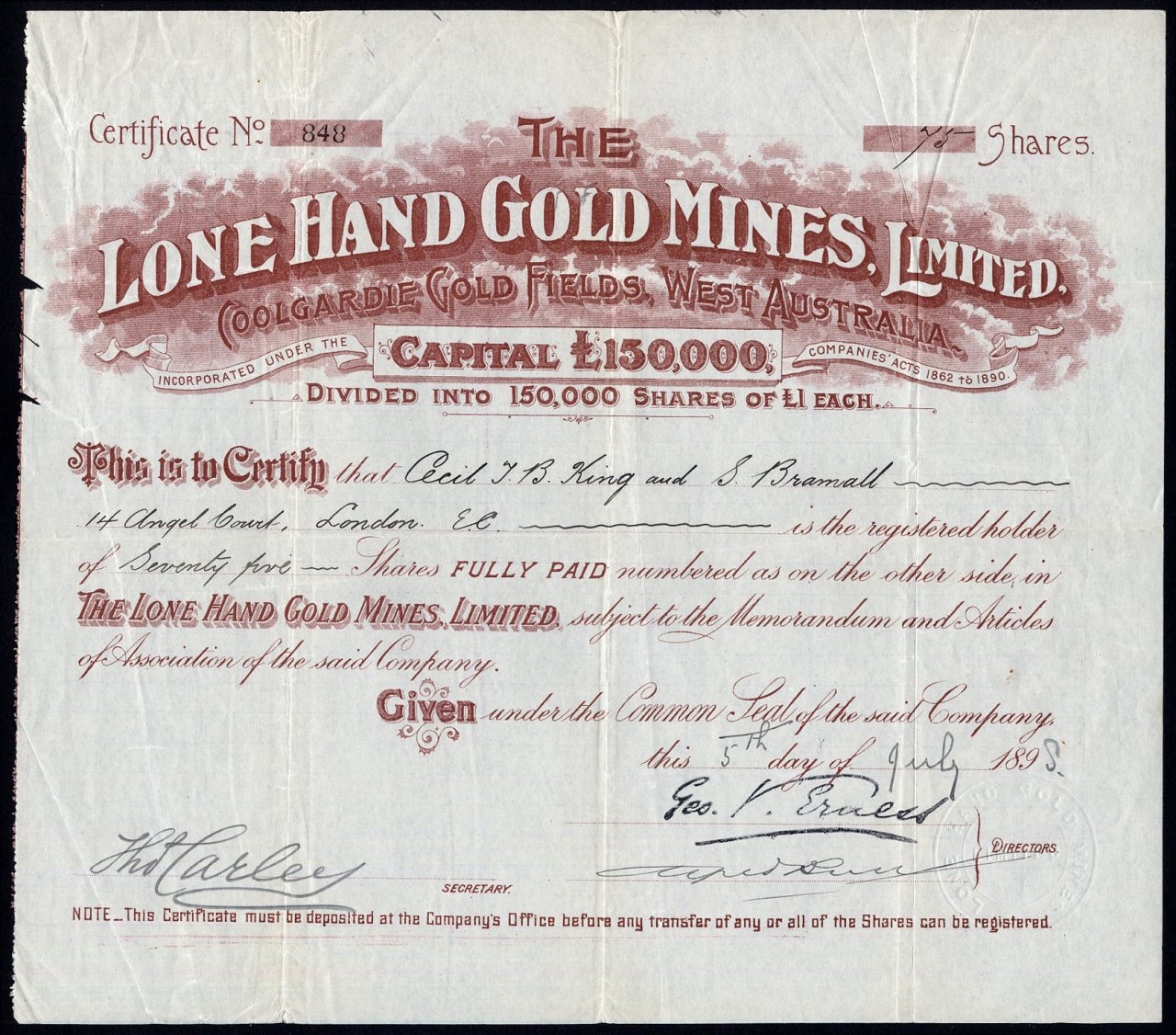 Registrato nel 1895. Miniere nei campi d’oro di Coolgardie, Australia occidentale. Dissolto <1916. Numero società 45486