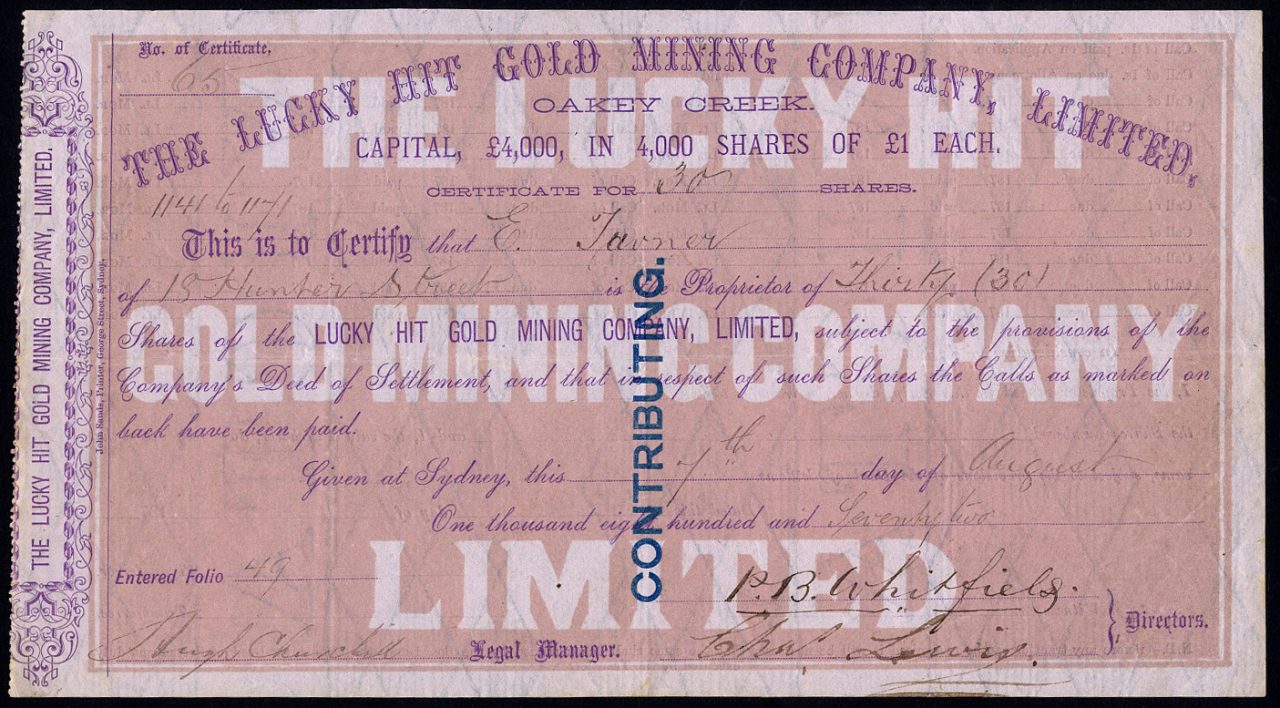 A-32495Lucky Hit Gold Mining Company Limited-1Nuovo Galles del Sud1872£1 SharesR2 (1001-5000 pezzi)S3 (da 51 a 100 €)
