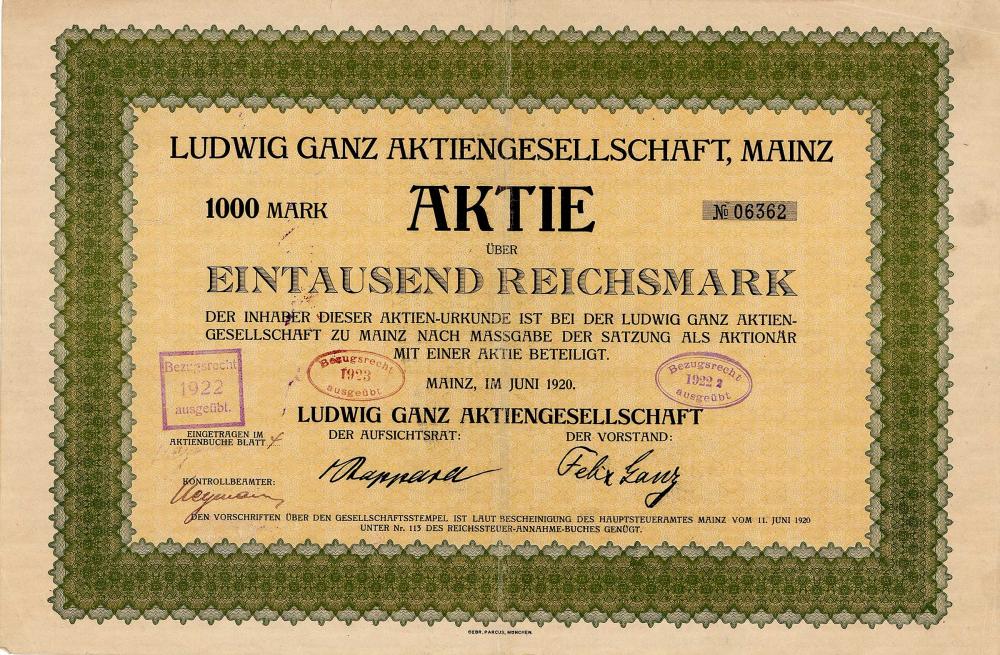 La città di Magonza, conosciuta come Magenza nella letteratura ebraica del Medioevo, era uno dei più importanti centri ebraici del Reno. Sul Judensand, il cimitero ebraico di Magonza, ci sono lapidi dell’XI secolo. La famiglia ebrea Ganz arrivò nella regione di Magonza nel XVI secolo e visse di commercio al dettaglio, artigianato e musicisti itineranti fino al XVIII secolo. All’inizio del XVIII secolo la famiglia si trasferì da Weisenau a Mainz. Adolph Ganz (1795-1869) divenne direttore del palcoscenico dell’opera e nel 1835 direttore della corte granducale, co-fondatore del “Mainzer Liedertafel”. Nel 1830, Hermann David Ganz fondò un negozio di manufatti e mobili in Flachsmarktstrasse 9. Il figlio Ludwig lo ampliò (tappeti orientali, oggetti d’arte, prodotti tessili) a Ludwigstrasse 2. Nel 1906 Felix Ganz costruì l’edificio per uffici Schillerplatz / Ludwigsstrasse. Magazzino in Binger Str. 26. Nel 1913 fu fondata la Ludwig Ganz AG allo scopo di continuare l’attività commerciale. Nel 1920 fondazione della filiale “Continentale Bank- und Handels-AG” a Francoforte a.M. Membro del consiglio di sorveglianza di questa società era tra le altre cose il successivo presidente della Reichsbank e ministro delle finanze del Reich Dr. Albero di Hjalmar. Durante la Grande Depressione, gli affari crollarono a tal punto che fu stipulato un accordo di liquidazione nel 1930 e il fallimento nel 1933. L’ex membro del consiglio Felix Ganz ha poi proseguito l’attività con una nuova GmbH (casa di tappeti e tende ex Ludwig Ganz m.b.H.). Nel 1936 la società fu arianizzata e rilevata dal firmatario autorizzato Julius Ochsenreither senza compenso. Nel 1936 una parte della proprietà sul Michelsberg fu espropriata per costruire la “Thingplatz”. Nel 1939 Felix Ganz dovette lasciare la proprietà, che ora fa parte del Volkspark, e visse con la moglie Erna della famiglia di banchieri Benfey a Magonza in “case ebraiche”, ad esempio a Rheinstr. 12 e in Kaiserstr. 32 di fronte al quartier generale della Gestapo. La coppia fu deportata a Theresienstadt il 27 settembre 1942 e ad Auschwitz nel 1944.