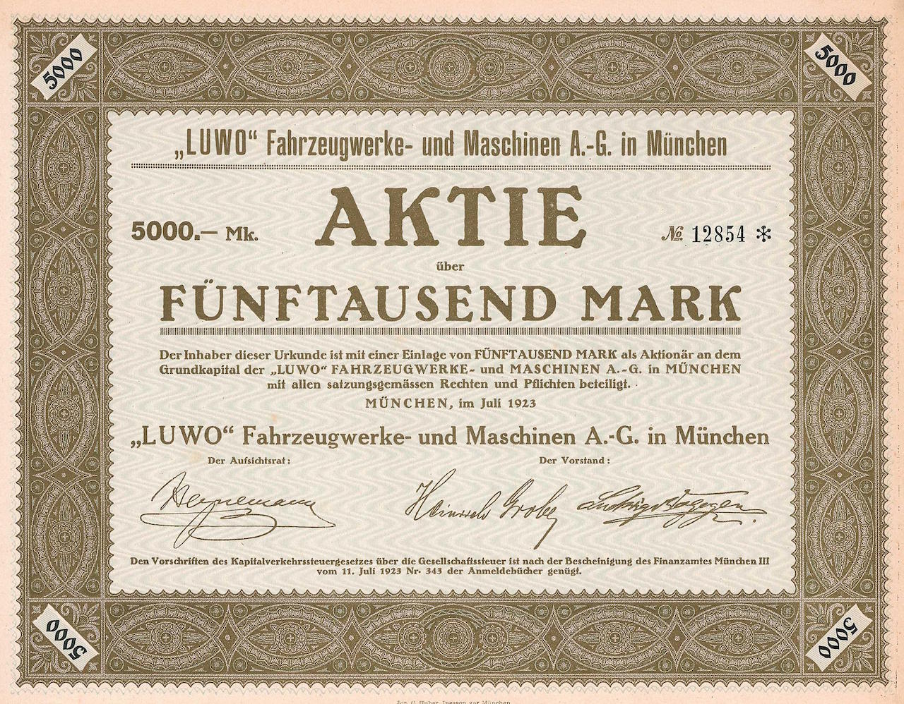 Fondata a marzo 1923. Fino a giugno 1923 era nominata Süddeutsche Maschinen AG (macchina del sud). Quindi LUWO Fahrzeugwerke und Maschinen AG. Produceva macchine elettriche e relativi accessori.
