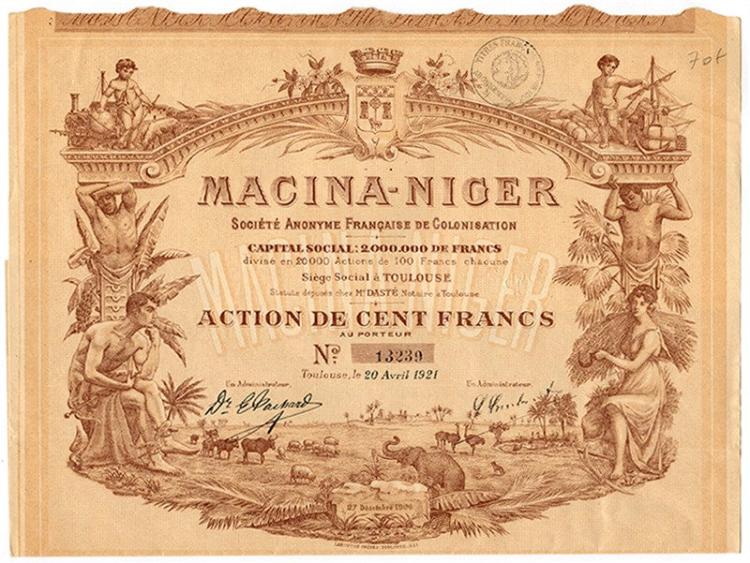 A-54276Macina-Niger – S.A. Francaise de Colonisation-1Tolosa19211 azione al portatore da 100 FFR2 (1001-5000 pezzi)S1 (da 0 a 25 €)