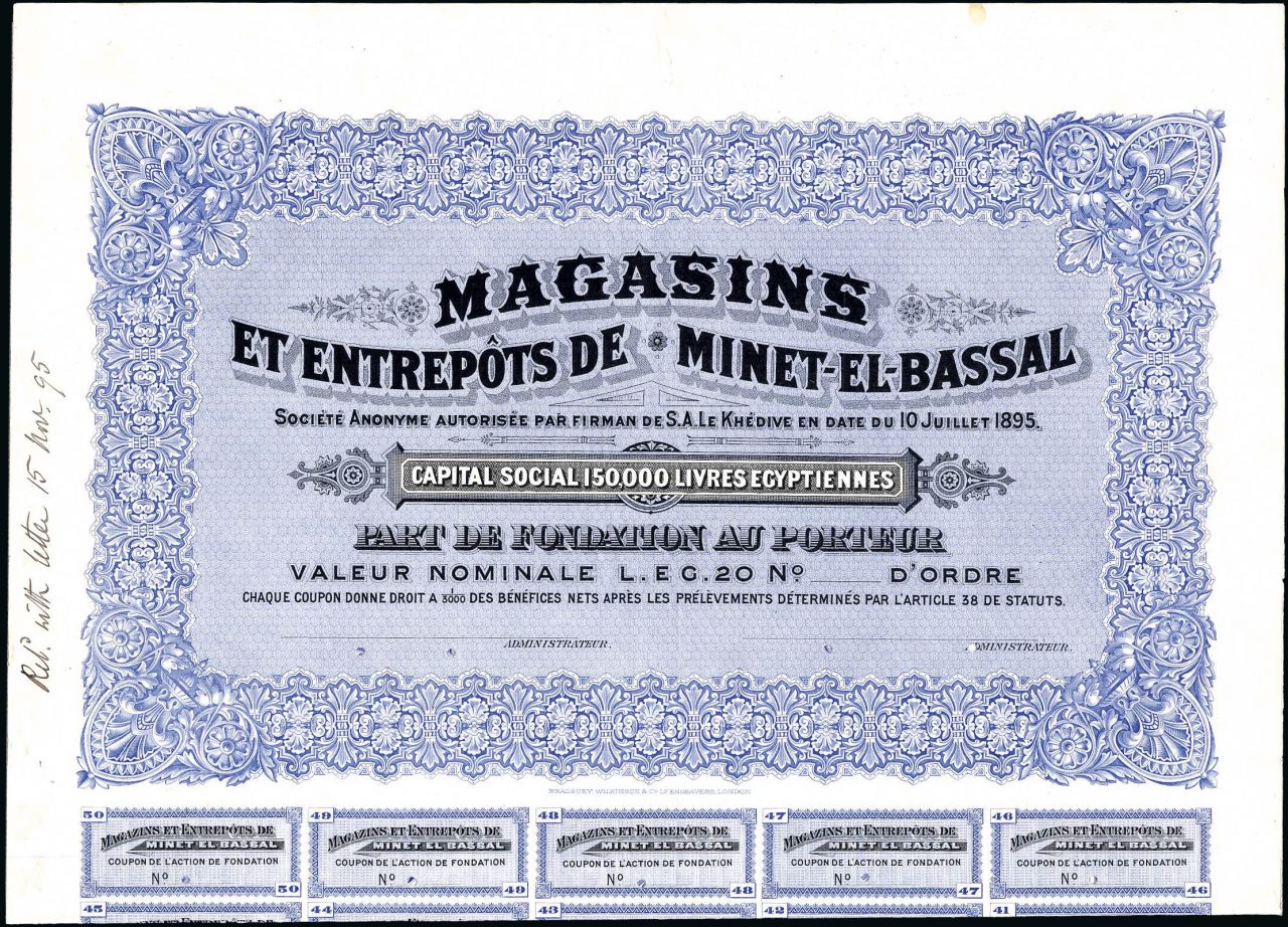A-35514Magasins et Entrepots de Minet-el-Bassal-1Egitto1895Founders Share - BlueR3 (501-1000 pezzi)S4 (da 101 a 250 €)