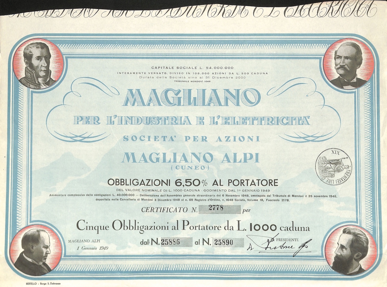 B-7470Magliano per l’Industria e l’Elettricità-2Bertello, Borgo S. DalmazzoCuneo19495 obbligazioni 6,5% da Lire 1.000R3 (501-1000 pezzi)S3 (da 51 a 100 €)