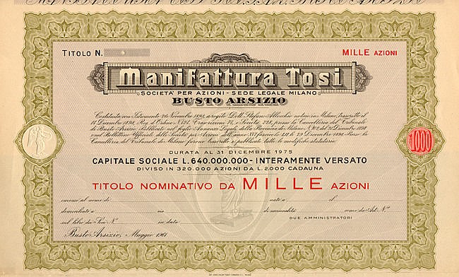 E-47855Manifattura Tosi S.p.A.-5Varese19611.000 azioni al portatore da Lire 2.000R1 (Più di 5000 pezzi)S1 (da 0 a 25 €)
