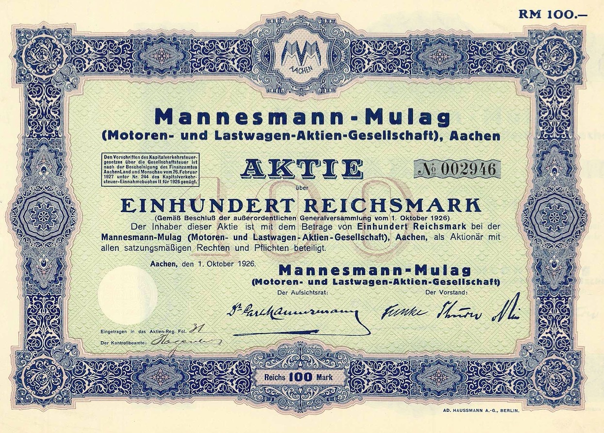 B-62341Mannesmann-Mulag-2Aachen19261 azione da 100 MarchiR3 (501-1000 pezzi)S3 (da 51 a 100 €)