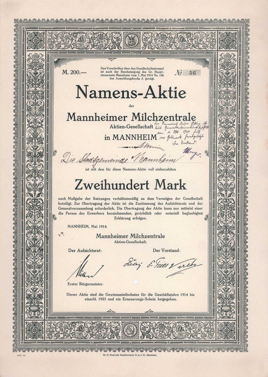 Il centro del latte, fondato nel 1911 come cooperativa, nel 1912 costruì un nuovo caseificio all'avanguardia su un terreno di oltre 27.000 metri quadrati nel centro di Mannheim (Viehhofstrasse 50), che in seguito impiegò fino a 500 persone. Trasformato in AG nel 1914. "La società ha lo scopo senza scopo di lucro di fornire ai residenti della città di Mannheim, in particolare alle persone svantaggiate, il latte e i prodotti lattiero-caseari migliori possibili ed economici." La città di Mannheim, che è molto impegnata nella società, aveva il diritto di nominare due dei tre membri del consiglio. All'inizio degli anni '60, gli azionisti erano la Cooperativa produttrice di latte Mannheim eGmbH (35%), la città di Mannheim (32%), la Landw. Genossenschaftsberatung G... Altro