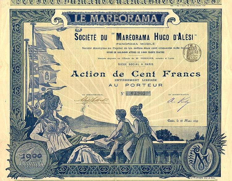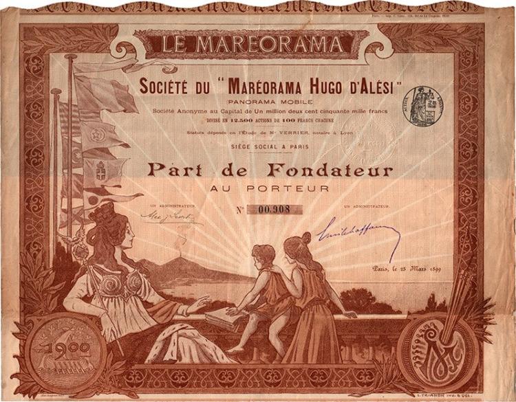 Hugo d’Alesi (1849-1906) - illustratore francese di manìfesti pubblicitari - ideò il mareorama, presentato con successo all’Esposizione Universale di Parigi del 1900. Si trattava della simulazione di un viaggio in nave mediante lo scorrere di illustrazioni panoramiche sopra una piattaforma oscillante ed altri effetti speciali, innovativi per l’epoca. Precursore del cinema.