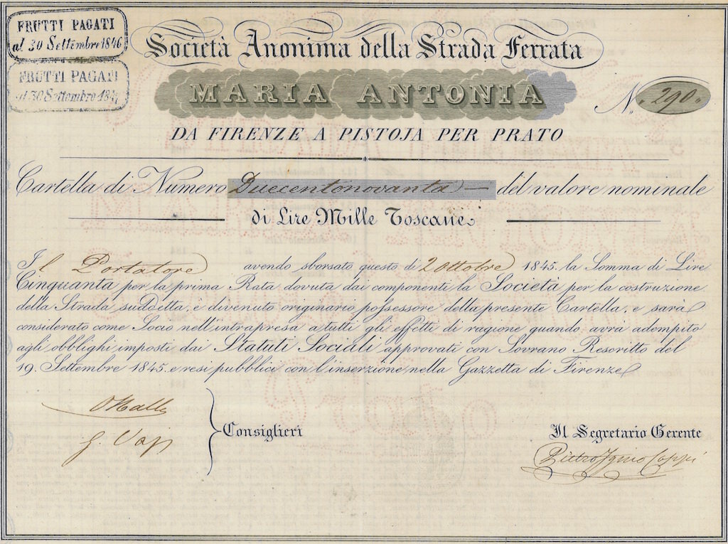 A-4993Maria Antonia S.A. Strada Ferrata da Firenze a Pistoia per Prato-1N.D.Firenze1845VariabileR7 (26-50 pezzi)S7 (da 1.001 a 1.500 €)