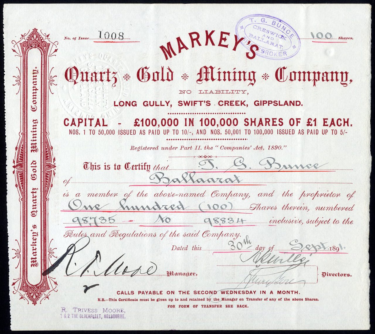 Registrato a Victoria. Miniere a Long Gully, Swift’s Creek, Gippsland, Victoria.
