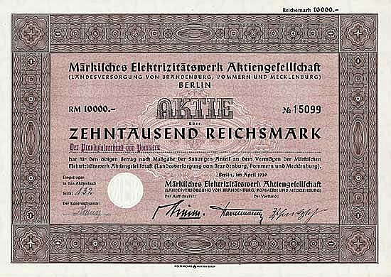 Fondata nel 1900 da A.E.G. come il primo impianto terrestre nella provincia di Brandeburgo, dove c’erano circa 100 centrali elettriche locali. A Finow, vicino a Eberswalde, è stata costruita una centrale a carbone fossile sul Canale di Hohenzollern secondo i piani del Prof. Klingenberg. Nel 1916 la provincia di Brandeburgo acquisì la maggioranza delle azioni. Nel 1931 il Free State of Meclemburgo-Schwerin ha introdotto le sue centrali elettriche statali. Nel 1934 fu incorporata la Pomerania Ueberlandzentrale. La MEW ha quindi rifornito 6.412 città e comuni in tutto il Brandeburgo, Meclemburgo e Pomerania, nonché il distretto di Lüneburg sulla destra dell’Elba.