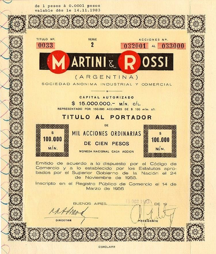 A-38399Martini & Rossi (Argentina) – Sociedad Anonima Industrial y Comercial-1Buenos Aires 19531000 azioni da 100 pesosR2 (1001-5000 pezzi)S2 (da 26 a 50 €)