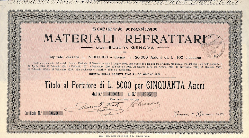 C-5468Materiali Refrattari Soc. An.-3Officina Carte Valori Coen & C. Milano - ParigiGenova192650 azioni da Lire 100R2 (1001-5000 pezzi)S2 (da 26 a 50 €)