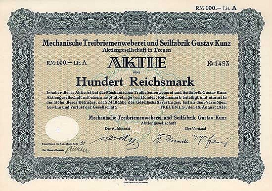 Fondata nel 1894 rilevando l’azienda Gustav Kunz, che esisteva dal 1868. Produzione di cinghie di trasmissione in pelo di cammello intrecciato, cinghie di cotone, nastri trasportatori, cinghie di seta, tele filtranti e tele, nonché corde in filo metallico e canapa. Durante la seconda guerra mondiale la conversione alla produzione di armamenti. Continuazione delle operazioni nella DDR come VEB Mechanische Triebriemenwebereien e Seilfabrik Treuen, successivamente fuse in VEB Vowetex Plauen.