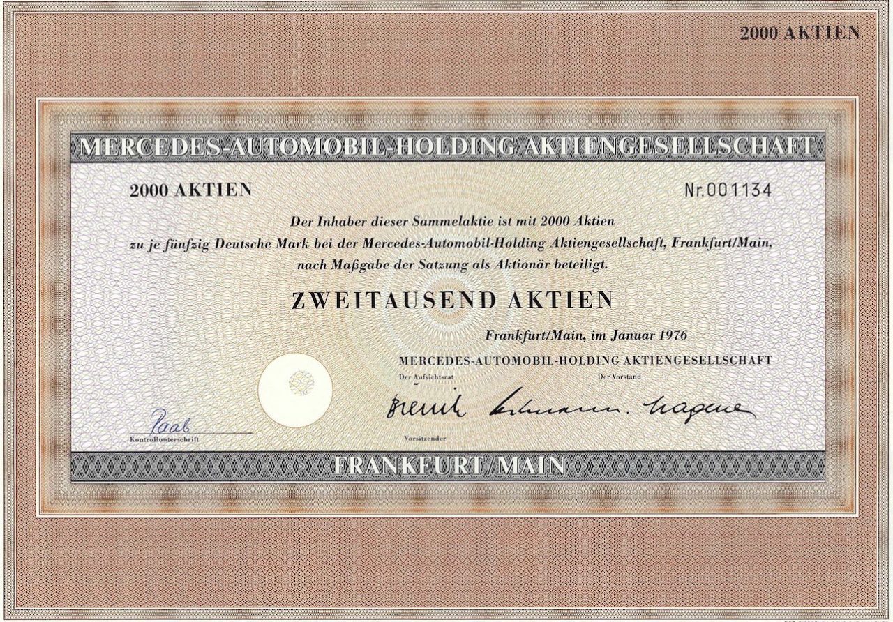 Nacque dal fatto che il Bustra Beteiligungsges mbH si è convertito in AG con delibera dell’assemblea degli azionisti del 14 novembre 1975. L’8 dicembre 1975 la ragione sociale venne cambiata in Mercedes-Automobil-Holding-AG. L’area di attività comprende l’acquisizione e la gestione di almeno il 25% del rispettivo capitale azionario di Daimler-Benz AG. I principali azionisti sono Stern e Stella Automobil-Beteiligungs-AG.