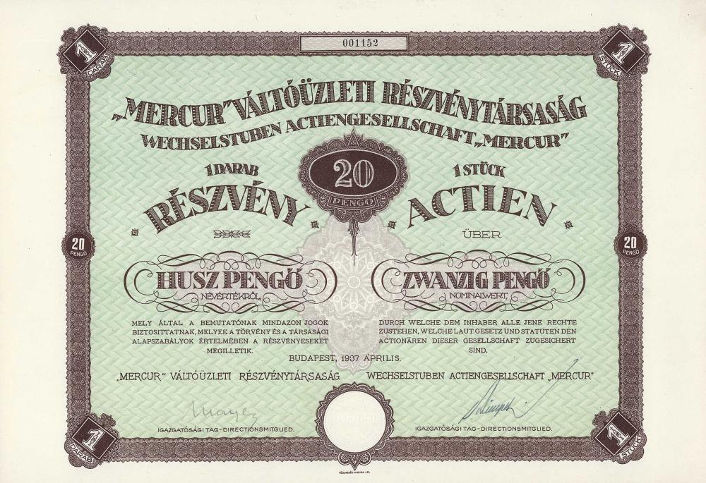 A-73385Mercur Valtouzleti Reszvenytarsasag-1Budapest19371 azione da 20 PengöR2 (1001-5000 pezzi)S3 (da 51 a 100 €)