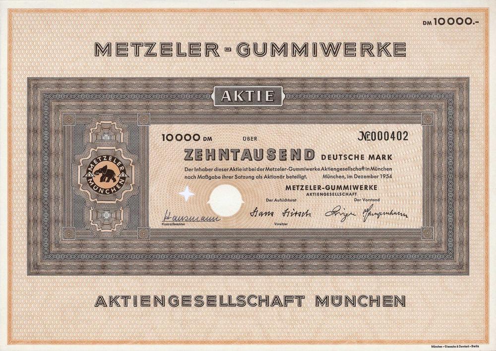 Fondata nel 1863 da Robert Friedrich Metzeler, dal 1901 AG Metzeler & Co., nel 1933 ribattezzata Metzeler Gummiwerke AG, nel 1965 a Metzeler AG. Lo stabilimento di Westendstr. 131-133 fabbricava pneumatici per motociclette, automobili, camion e carrozze trainate da cavalli, nonché articoli tecnici e chirurgici in gomma morbida. Successivamente l’acquisizione della Westland Gummiwerke GmbH a Lindau (articoli tecnici in gomma, materiale unico) e la creazione di un impianto di schiuma a Memmingen, inoltre il programma di produzione è stato ampliato per includere pitture, vernici e articoli per il tempo libero (materassi ad aria, gommoni, attrezzatura subacquea, barche pieghevoli, kayak in fibra di vetro, sci), nonché film per l’imballaggio e involucri di salsiccia. Nel 1974 Bayer AG rilevò le tre società operative Metzeler Kautschuk AG a Monaco, Metzeler Schaum GmbH a Memmingen e Metzeler Isobau GmbH a Bad Wildungen e Mannheim. Segue una disastrosa disputa tra gli azionisti esistenti, Bayer AG e l’Ufficio federale dei cartelli, l’anno successivo Metzeler AG scompare dai manuali di borsa. Nel 1978 ristrutturazione con lo spin-off di Metzeler Automotive Profile Systems, Lindau (leader di mercato nelle guarnizioni di carrozzeria) e trasferimento della produzione di pneumatici dallo stabilimento di Monaco allo stabilimento di Breuberg a Odenwald, dove da allora vengono prodotti solo pneumatici per motociclette. Nel 1986 Metzeler Kautschuk GmbH è stata rilevata dal gruppo Pirelli.