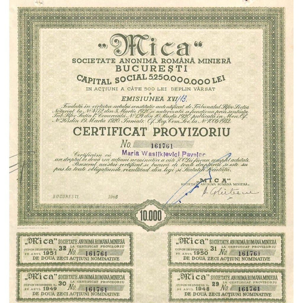 Certificato provvisorio nominativo del valore di 10000 lei.