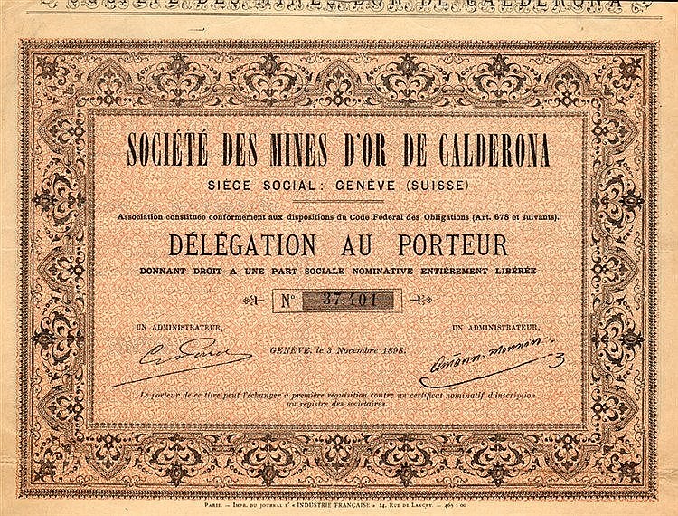 A-55360Mines d’Or de Calderona Société des-1Ginevra1898Quota di partecipazione al portatore--
