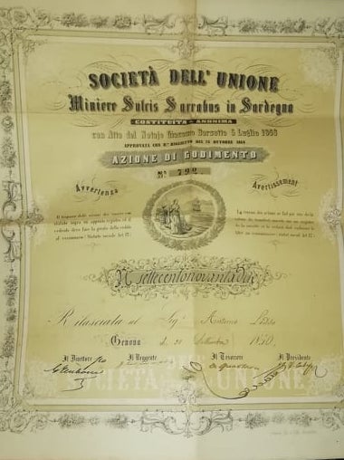 Le attività estrattive nel bacino carbonifero del Sulcis presero avvio nella seconda metà dell’Ottocento. La società genovese in questione, fondata nel 1848, vi esercitava 15 miniere con capitale di Lire 800.000 diviso in 1.600 azioni. Noti personaggi dell’epoca ne furono azionisti, quali l’intraprendente armatore genovese Raffaele Rubattino e il mazziniano Marchese Nicolò Cambiaso (firma autografa sul certificato come reggente). Fu liquidata nel 1866. Significativo sottolineare come la maggior parte di società minerarie operanti in Sardegna avessero capitali non sardi: una delle poche eccezioni è rappresentata da quella di Montevecchio.