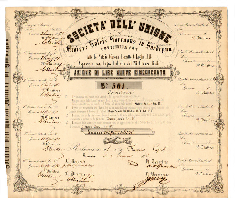 B-4945Miniere Sulcis Sarrabus in Sardegna Soc. dell’Unione-2-Genova18511 azione nominativa da 500 Lire nuoveR4 (251-500 pezzi)S5 (da 251 a 500 €)