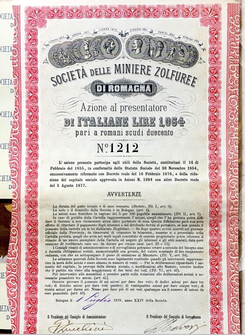 Dopo circa un decennio a causa della mancanza dei capitali proporzionali all’impresa, la società fu ricapitalizzata. Con atto notarile del 14 febbraio 1855 fu costituita la Società anonima delle miniere zolfuree di Romagna tra i cui azionisti emergono figure di rilievo della vita economica bolognese e del Risorgimento italiano quali Marco Minghetti, Francesco Pizzardi, Antonio Zanolini.