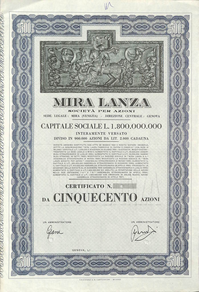 La Mira Lanza S.A. (o Miralanza) nacque, il 9 maggio 1924, dalla fusione di due antiche aziende italiane: la veneziana Fabbrica di candele di Mira e la torinese Premiata Reale Manifattura di saponi e candele steariche fratelli Lanza, già compresa nelle più note fabbriche della capitale piemontese nei primi anni Trenta del XIX secolo[1].