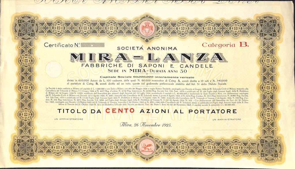 Al termine della prima guerra mondiale dopo un periodo di aspra concorrenza tra l'”Unione Stearinerie Lanza” e la “Fabbrica di Candele di Mira” viene sancita la fusione delle due società e la nascita della “Mira Lanza società anonima”. La sede della società venne stabilita a Genova, nei pressi della Saponerie Riunite di Cornigliano, su decisione dell’industriale Erasmo Piaggio, proprietario di quest’ultima e comproprietario della Fratelli Lanza. La Saponerie Riunite inizialmente non entrò a far parte della Mira Lanza in cui sarebbe confluita solamente nel 1939. A siglare la fusione delle società furono Moretti della Mira, il cavaliere Lanza e Giuseppe Piaggio, figlio del senatore Erasmo Piaggio. Moretti venne nominato presidente e Piaggio vicepresidente. La Mira Lanza poteva disporre di stabilimenti a Torino, Rivarolo, Mira, Roma, Napoli. In seguito la direzione, alla morte nel 1930 di Giuseppe Piaggio e nel 1932 del senatore Erasmo Piaggio, passa al fratello di Giuseppe, l’ingegnere Rocco Piaggio.[2]