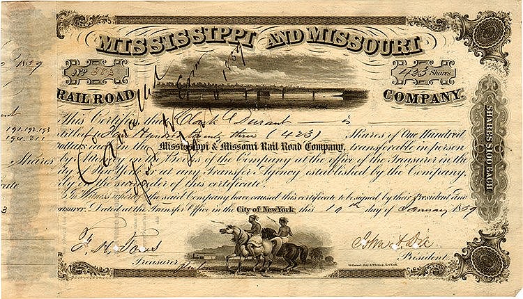 Veduta del ponte ferroviario sul Mississippi in alto, indiani a cavalli osservano il passaggio di un treno in basso. Firma autografa del politico John Adams Dix (1798-1879), in qualità di presidente della compagnia creata nel 1853 per costruire la prima ferrovia sul fiume Mississipi che congiungesse Davenport a Council Bluffs, entrambe nello stato di Iowa. Già Senatore poi Segretario al Tesoro degli Stati Uniti, Dix fu nominato dal Presidente Abraham Lincoln Generale dell’esercito dell’Unione durante la guerra di secessione americana. Dal 1863 al 1868 fu anche presidente della leggendaria Union Pacific & Erie Railroad proprio durante la costruzione della Prima Ferrovia Transcontinentale. Dal 1873 al 1874 fu anche il 24.mo Governatore di New York.