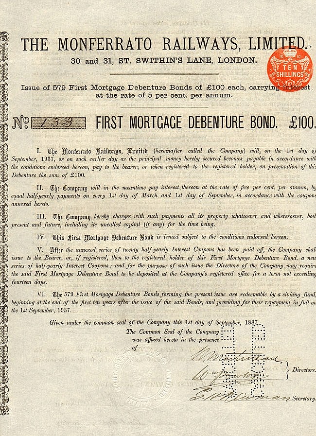 Bollo fiscale britannico su campo arancio. Timbro a secco con la ruota alata, marchio della compagnia fondata nel 1862. Il prestito, composto da 579 obbligazioni, servì a finanziare la costruzione della linea ferroviaria di 48 Km tra Chivasso e Casale Monferrato.