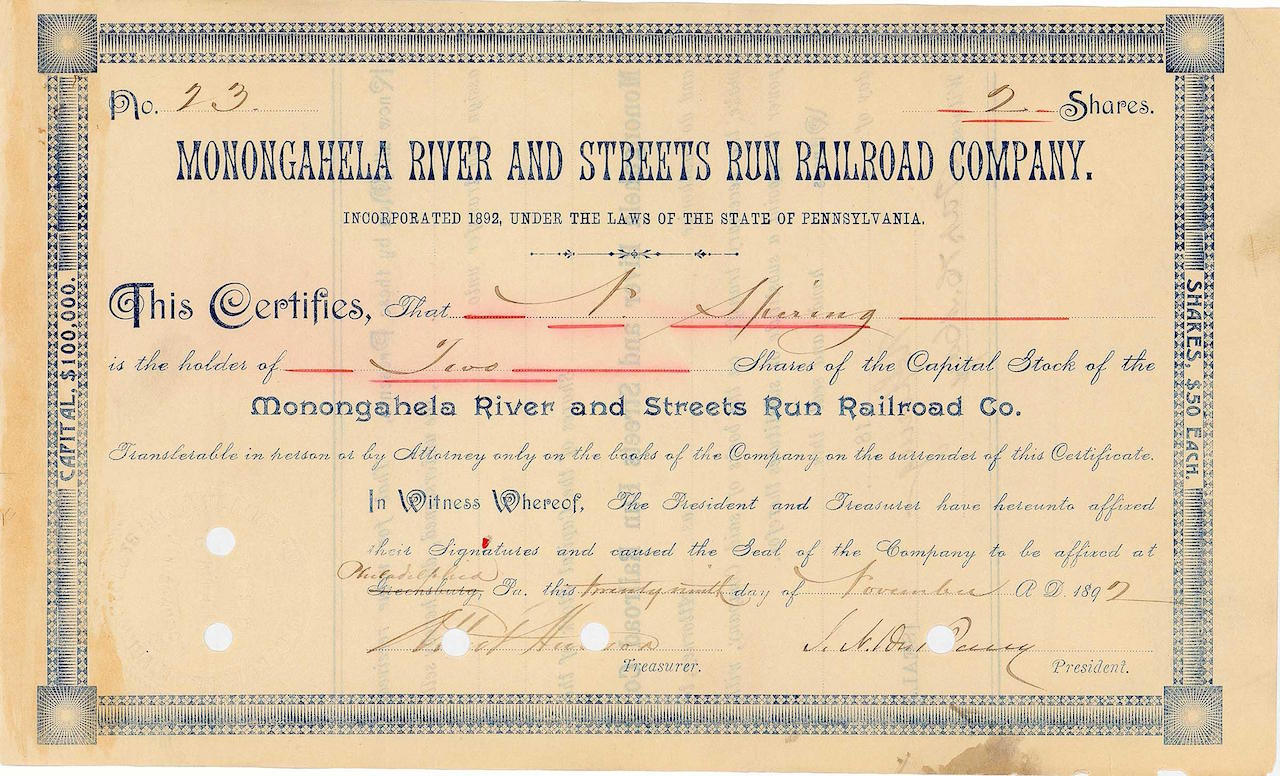 Fondata nel 1892 per costruire una linea di 2 miglia dalle miniere di carbone nella Valley of the Streets Run (nella contea di Allegheny) a Six Mile Ferry sul fiume Monongahela. Già fallita nel 1894 e poi incorporata da Pittsburgh, Virginia e Charleston Ry.
