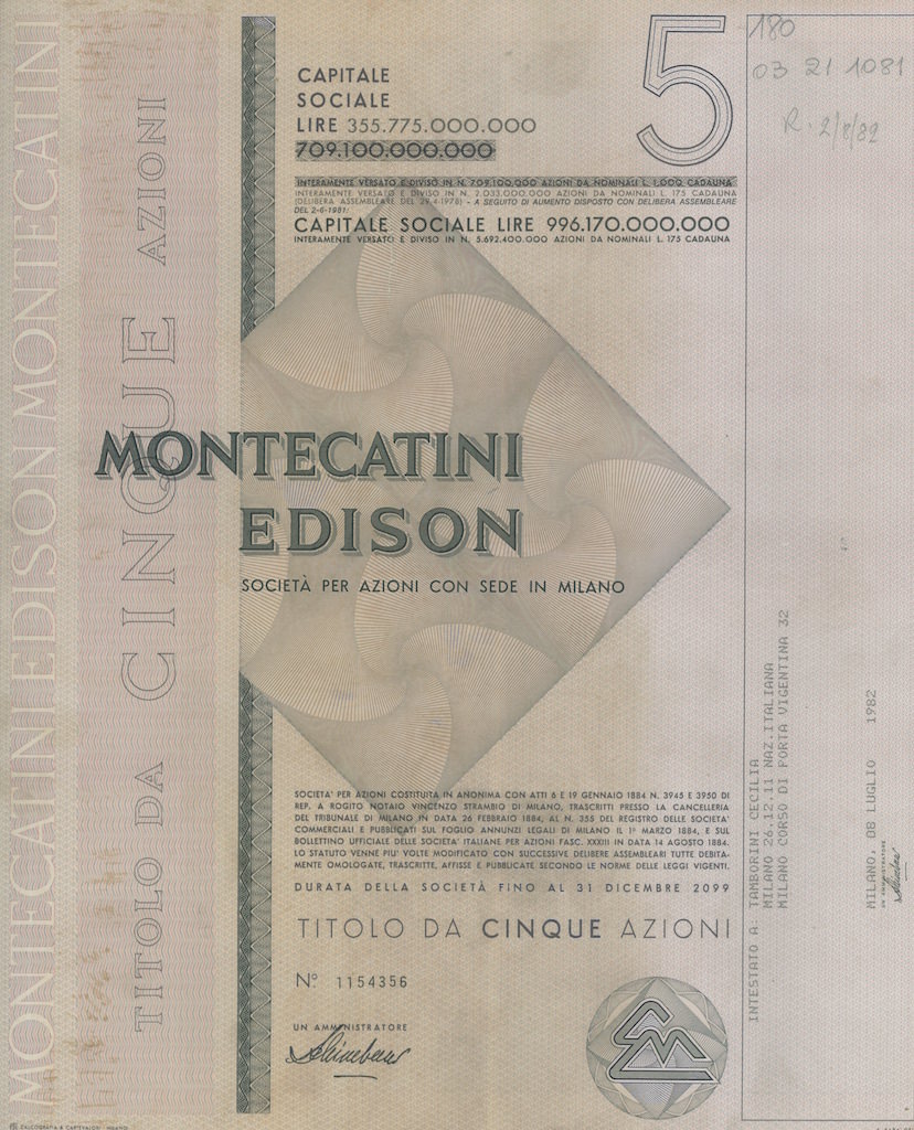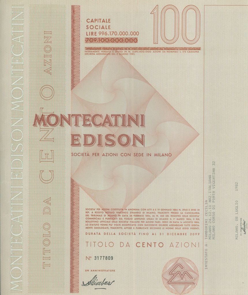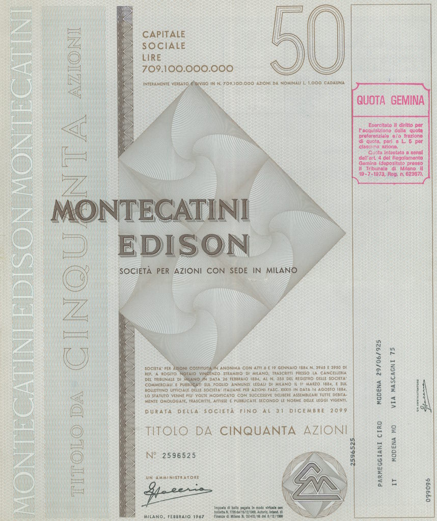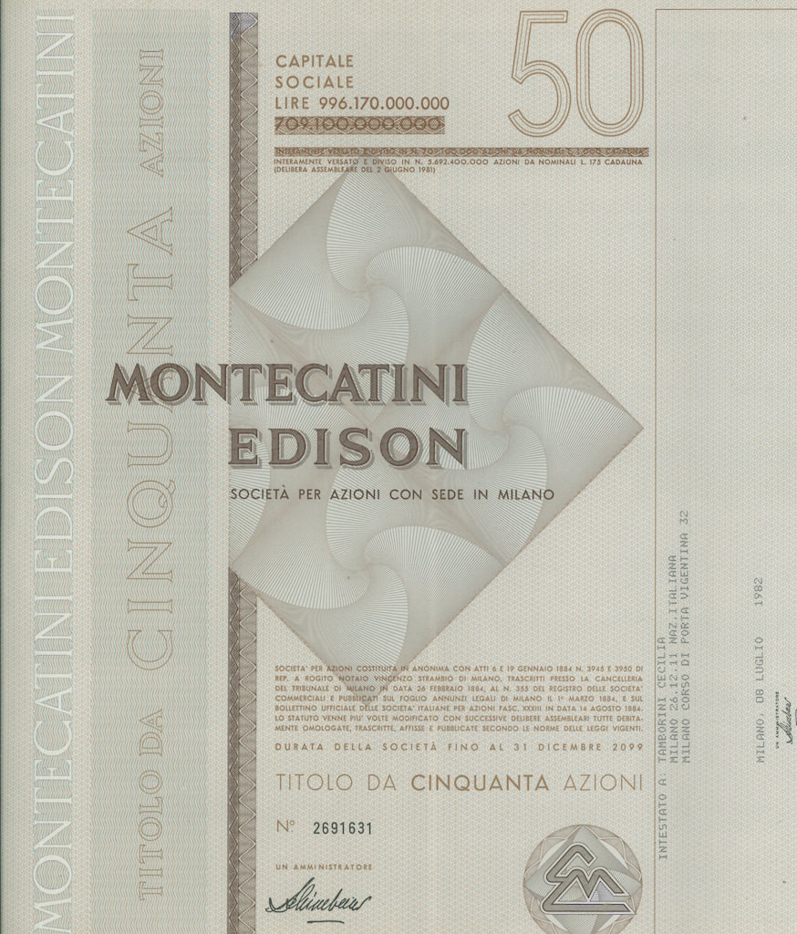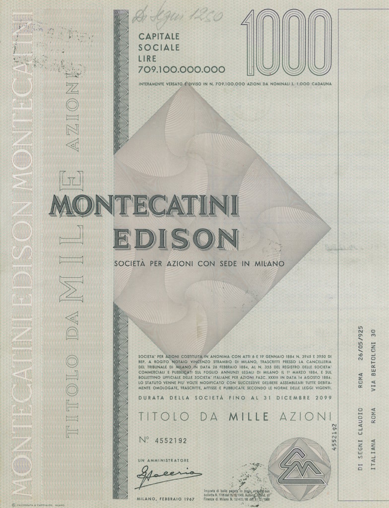 La Montedison nacque nel 1966 dalla fusione tra Montecatini ed Edison; la Montecatini era stata costituita nel 1888 a Montecatini Val di Cecina (PI) per lo sfruttamento delle locali miniere di rame; negli anni dieci del XX secolo entrò nel settore chimico e nei decenni successivi diventò, a colpi di brevetti e di acquisizioni, la maggior azienda chimica italiana, pressoché monopolista in alcune produzioni come l’acido solforico, i concimi, i coloranti (tramite la controllata ACNA); nel 1936, in collaborazione con l’AGIP, costituì l’Anic (Azienda Nazionale Idrogenazione Carburanti), con lo scopo di produrre benzina sintetica, e che sarebbe stato il primo nucleo dell’industria petrolchimica italiana. La Edison era nata nel 1895 a Milano e fu una delle prime aziende a sfruttare in Italia quell’energia idroelettrica che fu alla base della prima industrializzazione italiana, costruendo dighe lungo l’arco alpino, in particolare in Lombardia; già ai primi del ‘900 la Edison era uno dei gruppi industriali dominanti in Italia, suddividendosi il controllo del mercato elettrico nell’Italia del Nord con la SIP – Società Idroelettrica Piemontese, concentrata in Piemonte e Liguria, e la SADE, forte nel Nord Est.