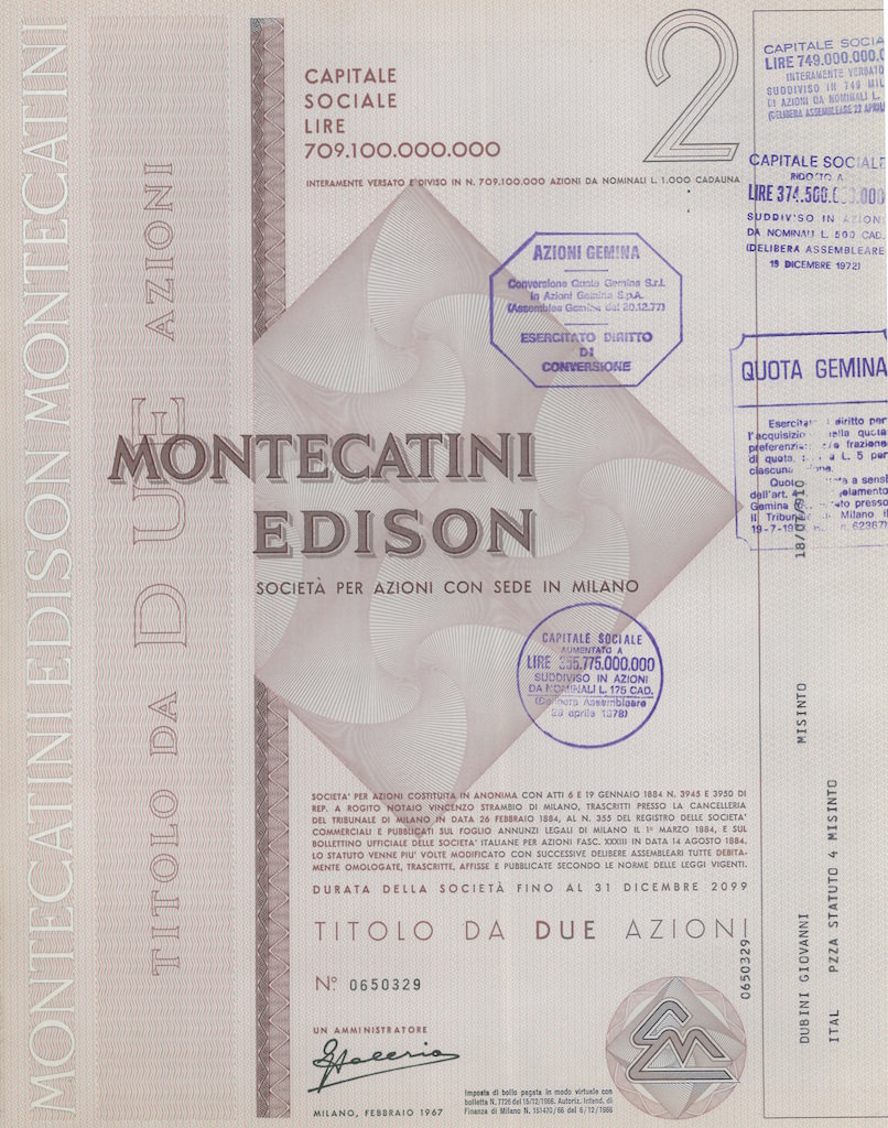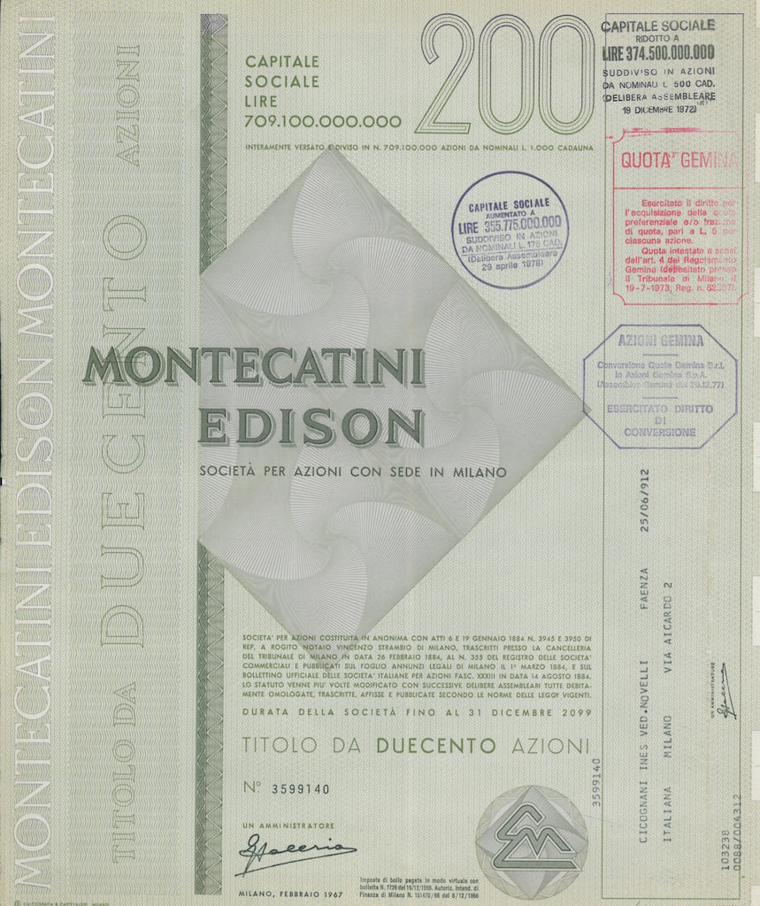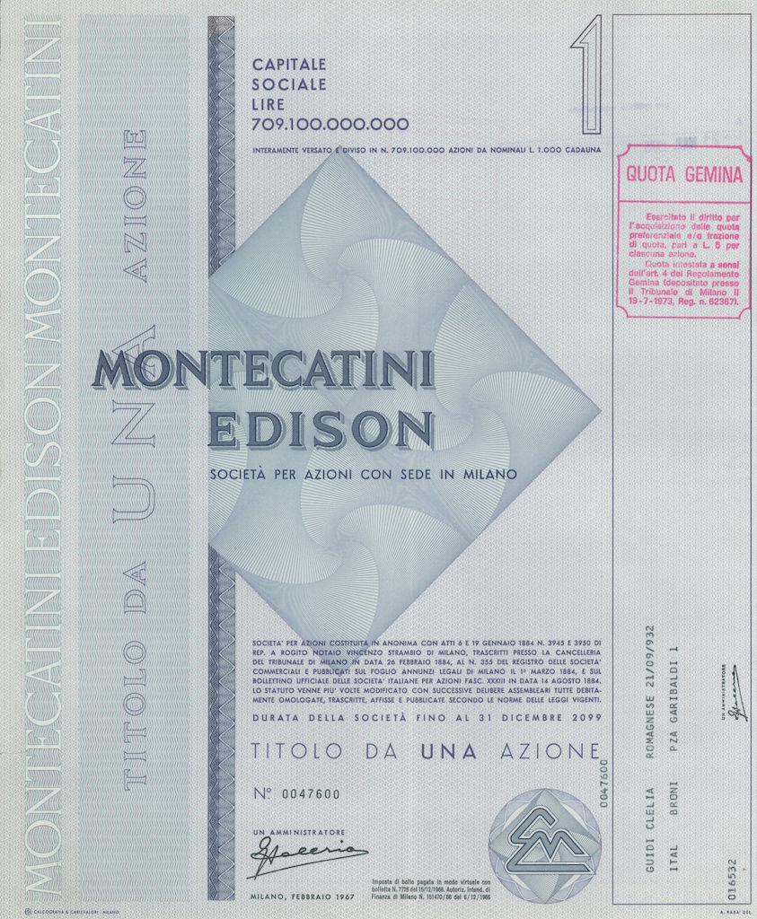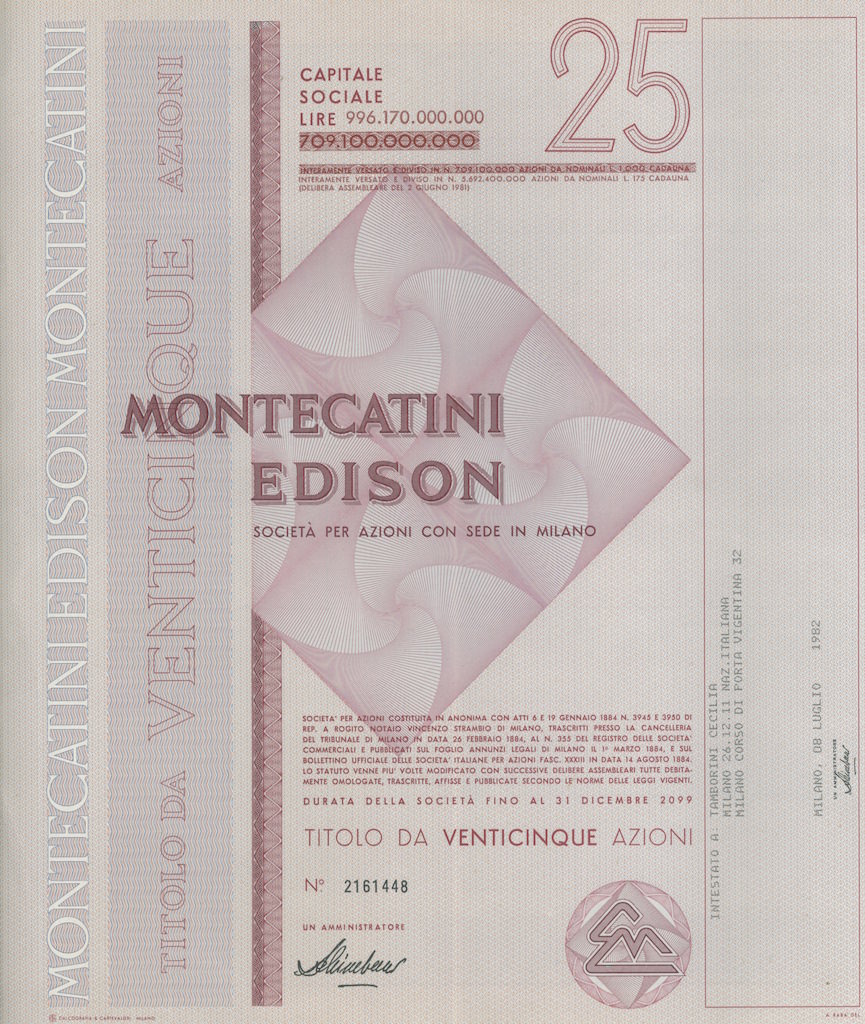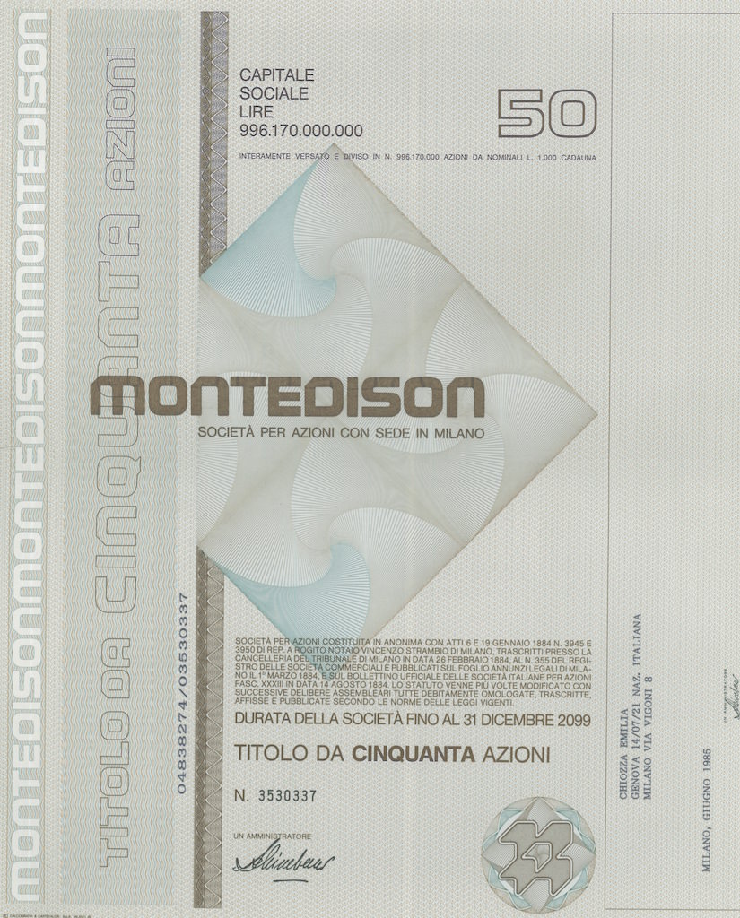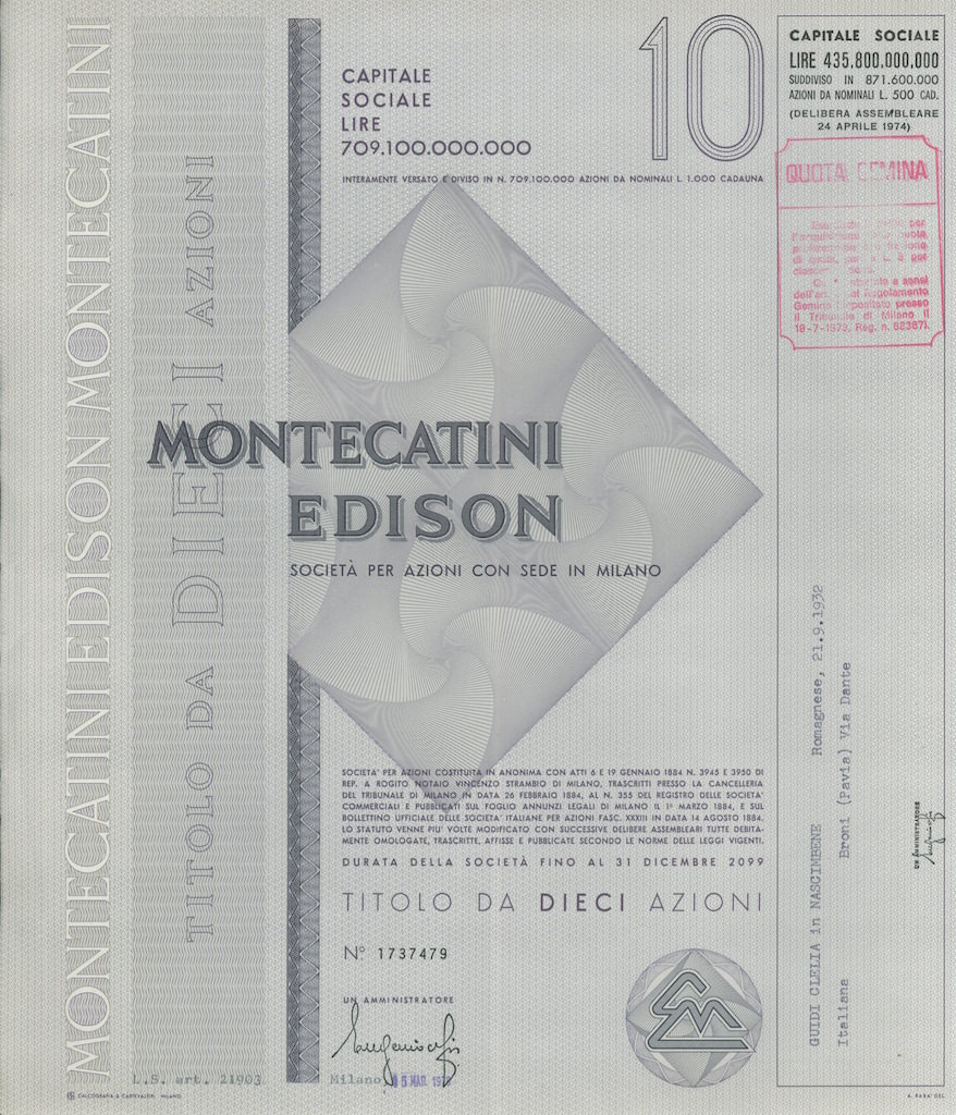 La Montedison nacque nel 1966 dalla fusione tra Montecatini ed Edison; la Montecatini era stata costituita nel 1888 a Montecatini Val di Cecina (PI) per lo sfruttamento delle locali miniere di rame; negli anni dieci del XX secolo entrò nel settore chimico e nei decenni successivi diventò, a colpi di brevetti e di acquisizioni, la maggior azienda chimica italiana, pressoché monopolista in alcune produzioni come l’acido solforico, i concimi, i coloranti (tramite la controllata ACNA); nel 1936, in collaborazione con l’AGIP, costituì l’Anic (Azienda Nazionale Idrogenazione Carburanti), con lo scopo di produrre benzina sintetica, e che sarebbe stato il primo nucleo dell’industria petrolchimica italiana. La Edison era nata nel 1895 a Milano e fu una delle prime aziende a sfruttare in Italia quell’energia idroelettrica che fu alla base della prima industrializzazione italiana, costruendo dighe lungo l’arco alpino, in particolare in Lombardia; già ai primi del ‘900 la Edison era uno dei gruppi industriali dominanti in Italia, suddividendosi il controllo del mercato elettrico nell’Italia del Nord con la SIP – Società Idroelettrica Piemontese, concentrata in Piemonte e Liguria, e la SADE, forte nel Nord Est.