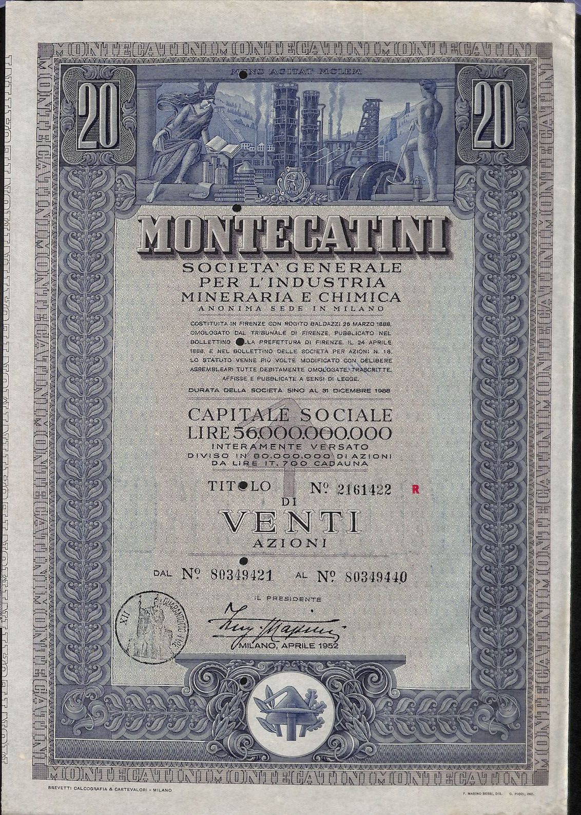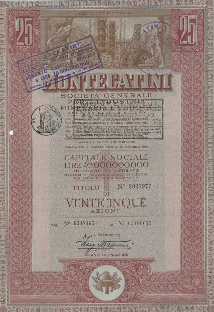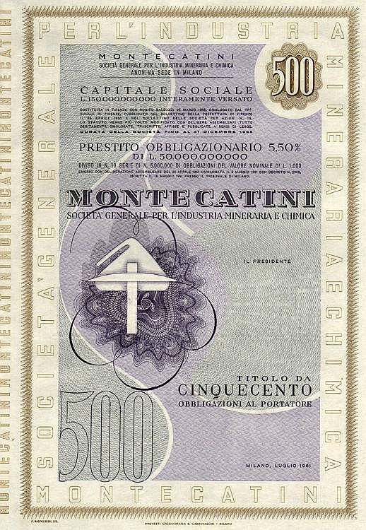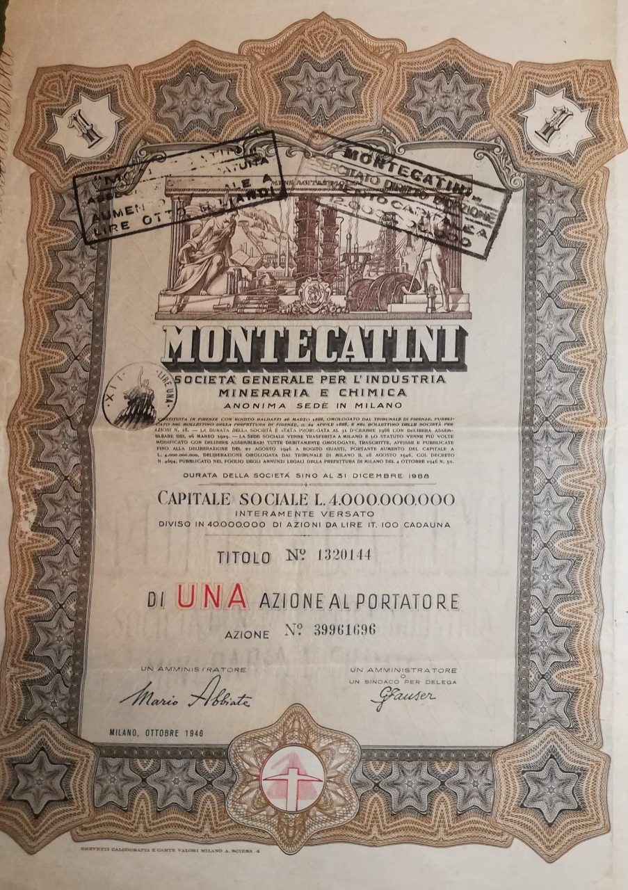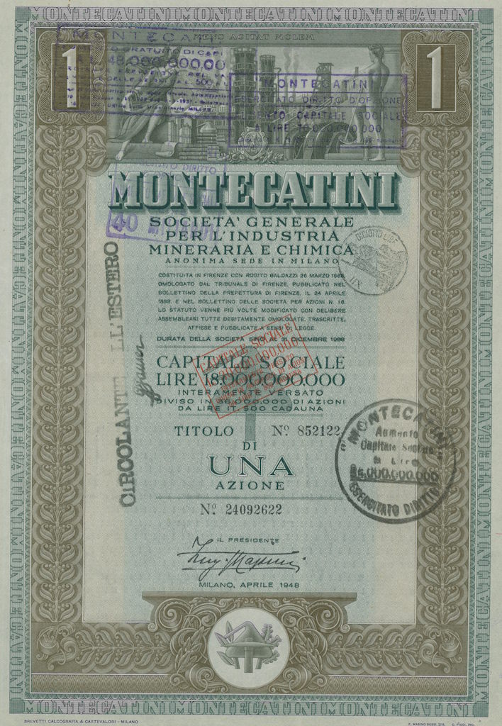 La Montedison nacque nel 1966 dalla fusione tra Montecatini ed Edison; la Montecatini era stata costituita nel 1888 a Montecatini Val di Cecina (PI) per lo sfruttamento delle locali miniere di rame; negli anni dieci del XX secolo entrò nel settore chimico e nei decenni successivi diventò, a colpi di brevetti e di acquisizioni, la maggior azienda chimica italiana, pressoché monopolista in alcune produzioni come l’acido solforico, i concimi, i coloranti (tramite la controllata ACNA); nel 1936, in collaborazione con l’AGIP, costituì l’Anic (Azienda Nazionale Idrogenazione Carburanti), con lo scopo di produrre benzina sintetica, e che sarebbe stato il primo nucleo dell’industria petrolchimica italiana. La Edison era nata nel 1895 a Milano e fu una delle prime aziende a sfruttare in Italia quell’energia idroelettrica che fu alla base della prima industrializzazione italiana, costruendo dighe lungo l’arco alpino, in particolare in Lombardia; già ai primi del ‘900 la Edison era uno dei gruppi industriali dominanti in Italia, suddividendosi il controllo del mercato elettrico nell’Italia del Nord con la SIP – Società Idroelettrica Piemontese, concentrata in Piemonte e Liguria, e la SADE, forte nel Nord Est.