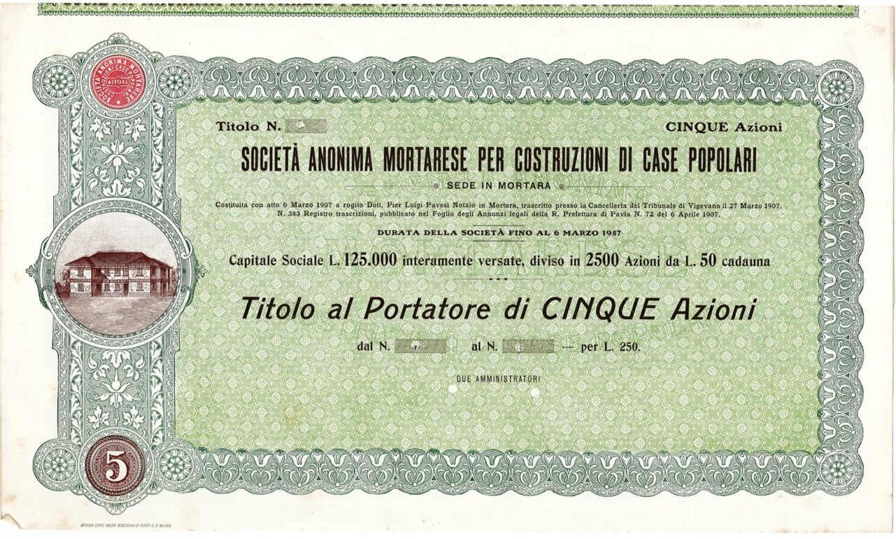 Stampate nell'officina Carte Valori Rebeschini di Turati e C. di Milano. Misurano 39x23 cm. Medaglione sul lato sinistro riproducente un immobile.